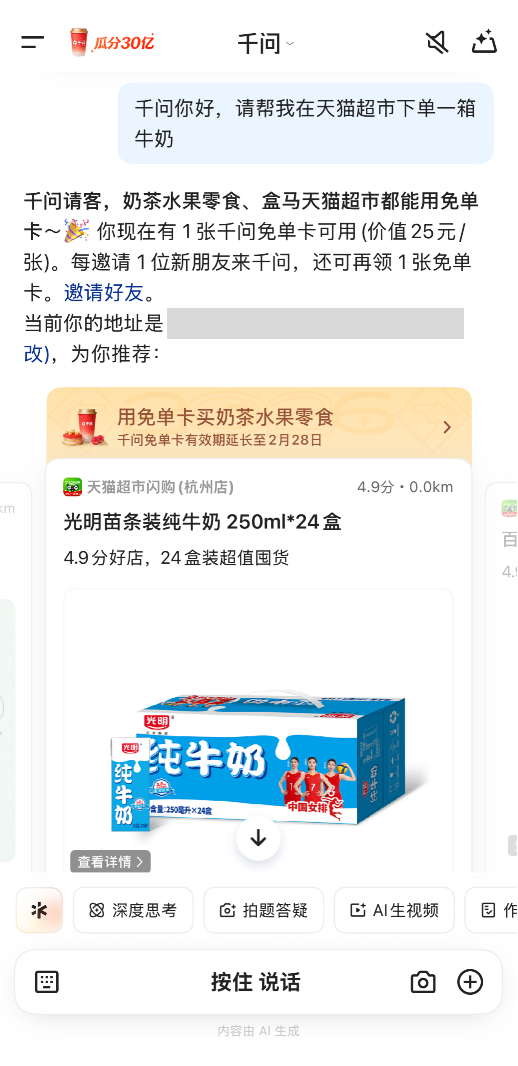 当代魔幻事件:我的AI管家开始包办超市购物了🛒千问免单卡新增天猫超市,一句话闪购4小时达。建议立刻集满21张卡,这种让AI跑腿还免单的机会,错过等明年!千问免单可以点天猫超市了 千问免单卡可以买年货