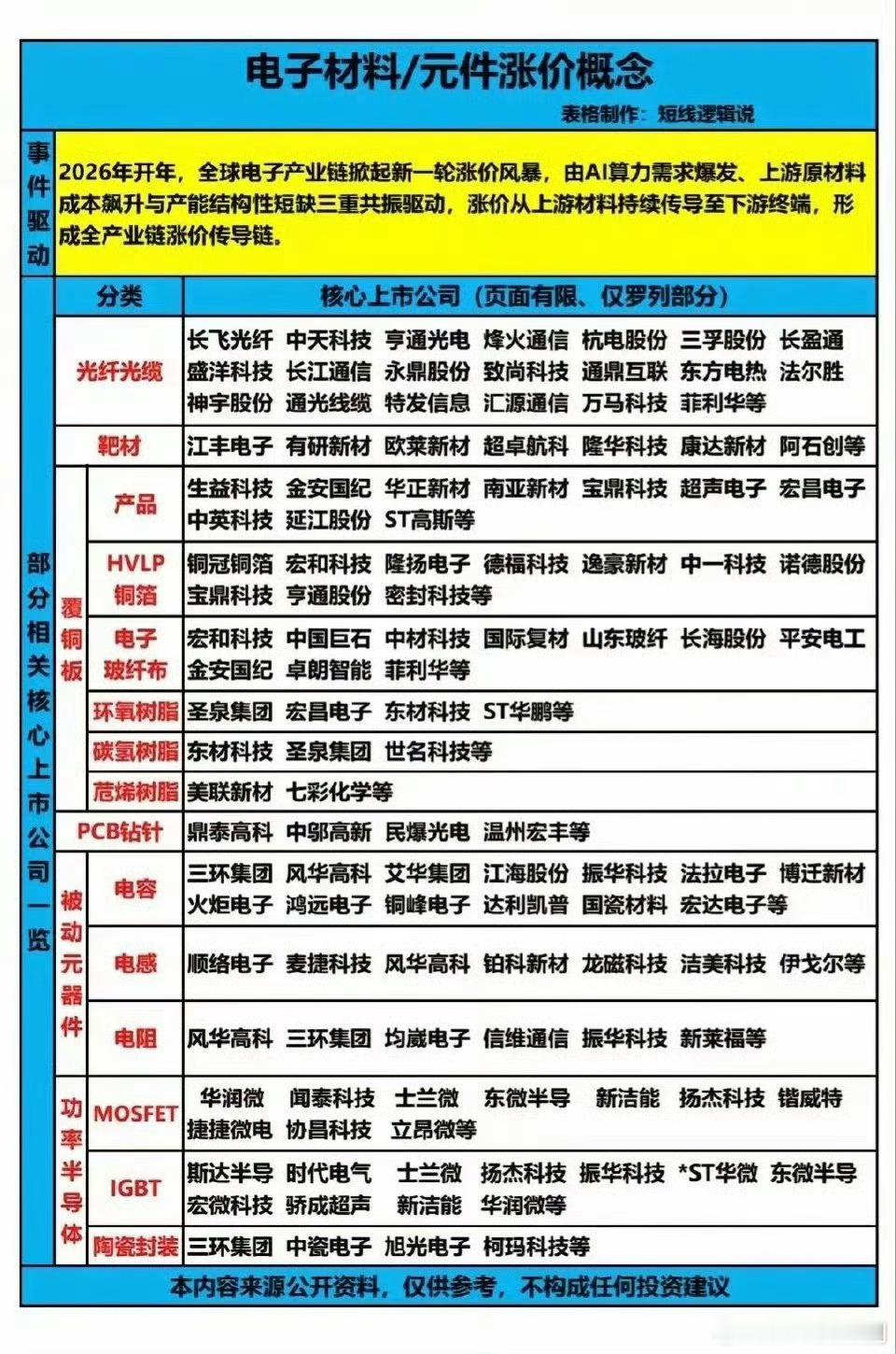 电子元器件(电阻/电感等):核心驱动力同样是“原材料成本+AI需求”。电阻的关键材料(陶瓷基体、金属浆料)和电感的核心材料(铁氧体、金属磁粉)价格普遍上涨。同时,AI服务器、汽车电子的升级大幅增加了对小型化、高性能元器件的用量,被动元件行业顺势提价以传导成本。