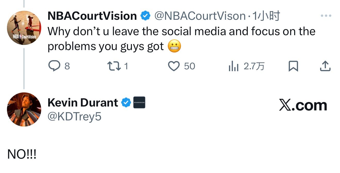 球迷:你为啥不离开社交媒体,专心解决你们球队的问题啊😬杜兰特:就不就不!!!火