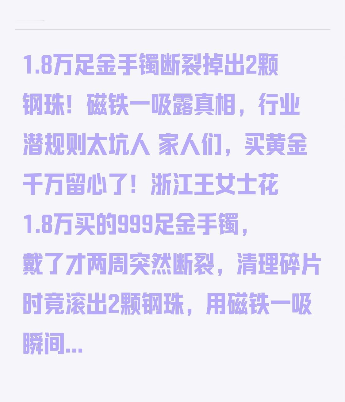 1.8万足金手镯断裂掉出2颗钢珠!磁铁一吸露真相,行业潜规则太坑人 家人们,买黄金千万留心了!浙江王女士花1.8万买的999足金手镯,戴了才两周突然断裂,清理碎片时竟滚出2颗钢珠,用磁铁一吸瞬间吸住——纯金明明无磁性,这到底是真金还是“镀金壳包钢珠”? 这事儿简直颠覆认知!王女士说,去年底在本地知名连锁金店买手镯时,销售拍着胸脯保证“实心打造、足金999,保值又耐戴”,上手沉甸甸的手感也让她彻底放心。可上周三做家务时,手镯毫无征兆地断成两截,她捡碎片时突然听到“啪嗒”两声,两颗直径3毫米的银白色小球滚了出来。 一开始她以为是外部杂物,直到用磁铁一试,钢珠被牢牢吸住,才惊觉不对劲。带着手镯找商家讨说法,对方先一口咬定“是外部异物混入”,见王女士拿出视频证据,又改口说“是生产时意外混入的模具配件”。这牵强的解释谁能信?两颗大小一致的钢珠,怎么可能刚好掉进手镯内部? 本以为只是个案,没想到转折点来了!王女士曝光后,无数网友晒出类似经历:“我去年买的手镯摔裂后掉出黑色胶块”“古法金镯敲着声音发闷,根本不是实心”。更有业内人士匿名爆料,这根本不是意外,而是行业“潜规则”——金价暴涨后,部分商家为省成本、增重量,会用“空心注胶+金属填充”工艺,钢珠、铅粒都是常用填充物,既能让手镯手感沉甸,又能少用黄金,利润直接翻倍。 经权威机构检测,王女士的手镯外壳确是足金,但内部有空腔和残留胶质,钢珠就是不锈钢材质。更气人的是,商家明明用了空心填充工艺,却没在标签上任何显著位置标注,反而宣称“实心”,这已经涉嫌虚假宣传,违反了《消费者权益保护法》。 更让人后怕的是安全隐患!专家说,手镯里的胶水长期佩戴可能老化释放有害物质,钢珠在撞击下还可能刺穿金壳划伤皮肤。而且这种掺假手段特别隐蔽,传统的火烧、看钢印都查不出来,只有断裂或剪开才能发现,不少人可能戴了几年都不知道自己买的是“钢珠金镯”。 其实类似乱象早就存在:江苏曾查出注水泥的黄金手镯,广东直播间的“古法金”断裂后流出工业润滑油,还有不法分子用掺铼、钨的黄金骗过专业检测。这些商家把消费者的信任当儿戏,用“科技狠活”钻监管空子,赚着黑心钱。 现在涉事金店虽承诺全额退款并召回同款,但这场信任危机远没结束。咱们普通人买黄金,图的就是一份放心和保值,可谁能想到,花大价钱买的“真金”,里面竟藏着廉价钢珠? 这里给大家提个醒:买黄金一定要选正规大品牌,索要权威检测证书,仔细看标签是否标注“空心”“含非贵金属部件”;上手掂量时,空心镯再重也没有实心镯的坠手感,敲击声音发闷的要警惕;最好保留购物凭证和全程录像,一旦发现问题及时找12315维权。 真金不怕火炼,诚信才是商家的立身之本。如果连黄金都能掺假,还有什么能让人放心?你有没有遇到过黄金消费的坑?欢迎在评论区聊聊,也转发给身边买黄金的朋友,一起避坑!