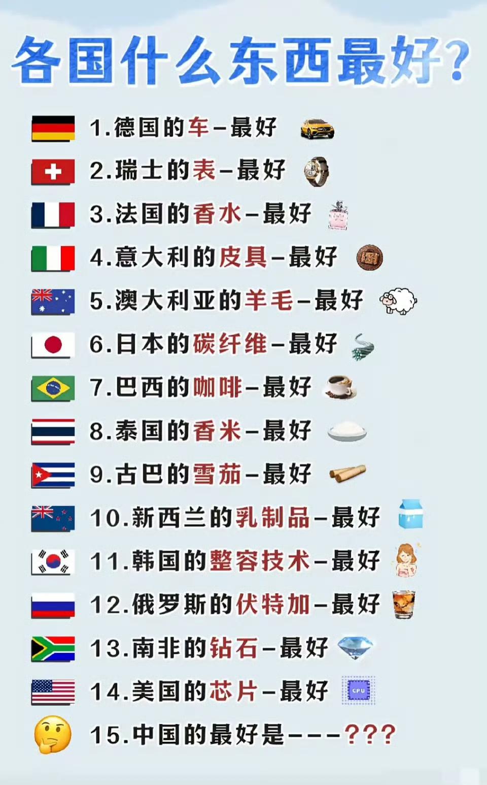 各国的什么东西最好? 第一,瑞士的表最好。 第二,法国的香水最好。 第三,意大利的皮具最好。 第四,德国的汽车最好。 第五,日本的电子产品最好。 第六,中国的丝绸最好。 第七,澳大利亚的羊毛制品最好。 第八,巴西的咖啡最好。 第九,印度的香料最好。 第十,泰国的大米最好。 第十一,韩国的化妆品最好。 第十二,美国的科技产品最好。 第十三,丹麦的乳制品最好。 第十四,俄罗斯的伏特加最好。 第十五,南非的钻石最好。 第十六,阿根廷的牛肉最好。 第十七,埃及的棉花最好。 第十八,加拿大的木材最好。 第十九,新西兰的乳制品最好。 第二十,西班牙的橄榄油最好。 第二十一,挪威的三文鱼最好。 第二十二,马来西亚的橡胶最好。 第二十三,菲律宾的芒果干最好。 第二十四,土耳其的干果最好。 第二十五,波兰的琥珀最好。 第二十六,比利时的巧克力最好。 第二十七,卢森堡的钢铁最好。 第二十八,爱尔兰的威士忌最好。 第二十九,匈牙利的鹅肝最好。 第三十,希腊的橄榄油最好。 还真别说,咖啡是好东西。特别是南美的咖啡。 对于长期伏案工作的办公族来说,黑咖啡简直是位“健康小卫士”!久坐容易让身体僵硬、代谢变慢,而黑咖啡里的咖啡因能像小马达一样,促进血液循环,让身体暖和起来,缓解久坐带来的酸痛感。 同时,大脑长时间运转容易疲劳,黑咖啡不仅能通过阻断腺苷受体来提神醒脑,提升注意力和工作效率,其含有的多酚类物质还能像“保护罩”一样,帮助保护神经细胞,长期饮用有助于维持大脑健康,降低因长期脑力劳动可能带来的神经衰退风险。 不过,黑咖啡虽好,但别贪杯哦!过量饮用可能会让神经“太兴奋”,反而影响健康。所以,适量来一杯,让工作更高效,身体更轻松!
