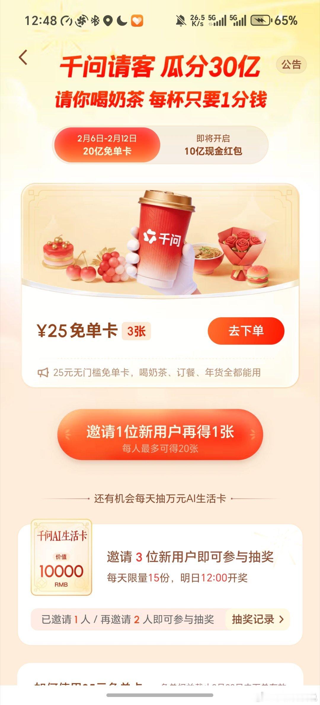 兄弟们,千问正式上线30亿请客全国活动啦,下载千问APP,即可获得25元免单额度,可以拿去买年货,点外卖、生鲜、盒马都可以!在评论区晒出你的千问免单截图,将随机抽取五名粉丝,再送你一次25元红包!千问