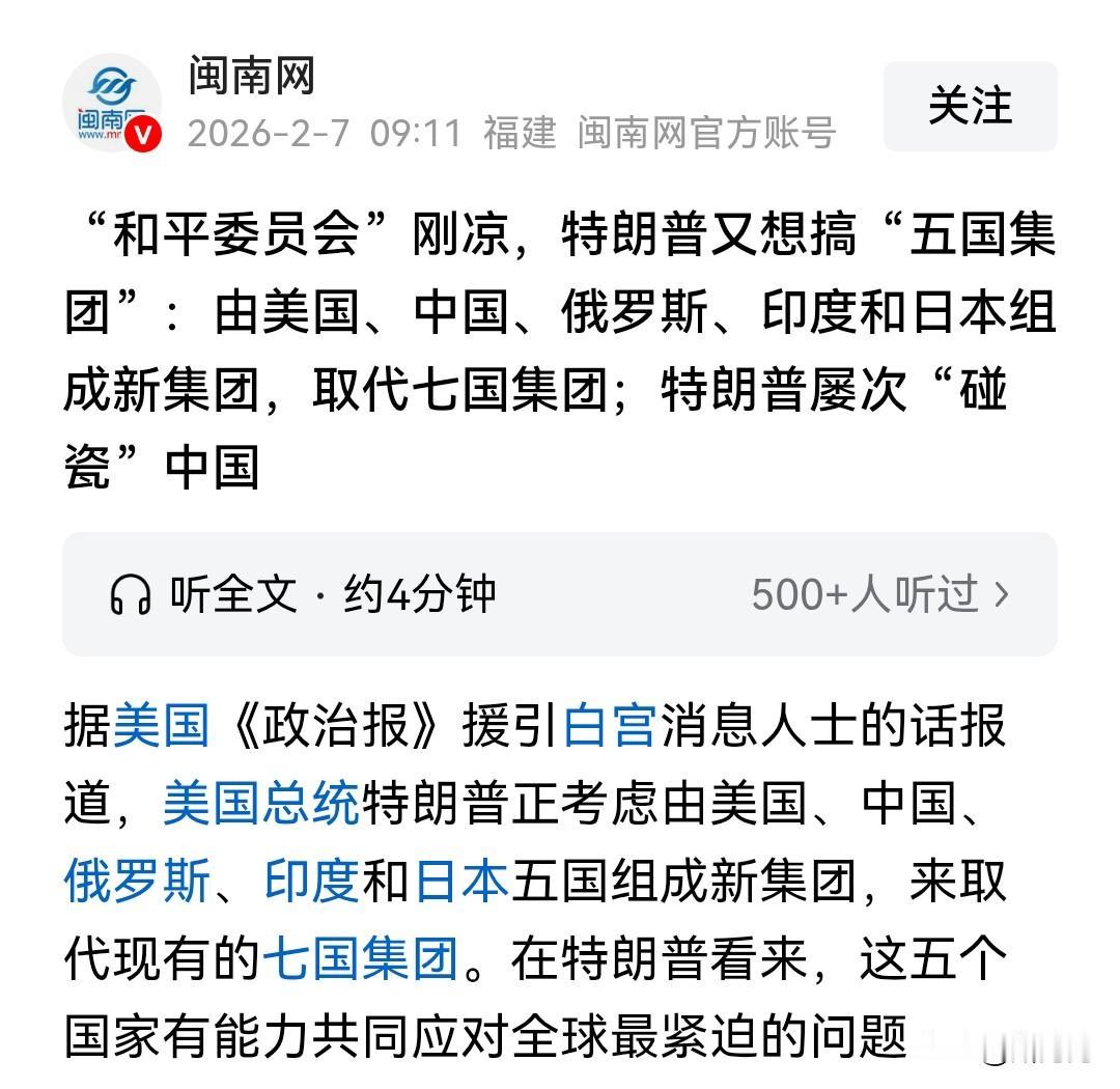 特朗普一天一个花样,真是精力旺盛!刚刚成立完“和平委员会”,会员还没凑满数又要搞“五国集团”。 不得不说,特朗普的想法真是异想天开。用“五国集团”取代“七国集团(G7)”,这想法完全是服务于特朗普的美国,私心太重,恐怕中俄一点兴趣都没有。具体理由如下: 首先,中俄与日关系因为高市早苗的挑衅而剧烈紧张,如果由高市早苗领导的日本在里面,中国和俄罗斯就不可能加入,除非高市早苗下台,新上来一个温和中立派,否则一点机会都没有; 其次,美国仇中的本性不会改变,中国就不可能帮特朗普站台; 再次,中国始终以联合国为全球治理公认组织,任何得不到全球公认有失公平的“黑组织”中国都不会参与其中; 最后,中国有自己的想法,随着中国的影响力不断壮大,中国会按照自己的计划谋定未来的战略。 如果美国不做出改变,不与中国相向而行,那中美博弈就一定不会停止。特朗普搞出的所谓国际组织中国压根就不会看得上。 新锐领航权益升级