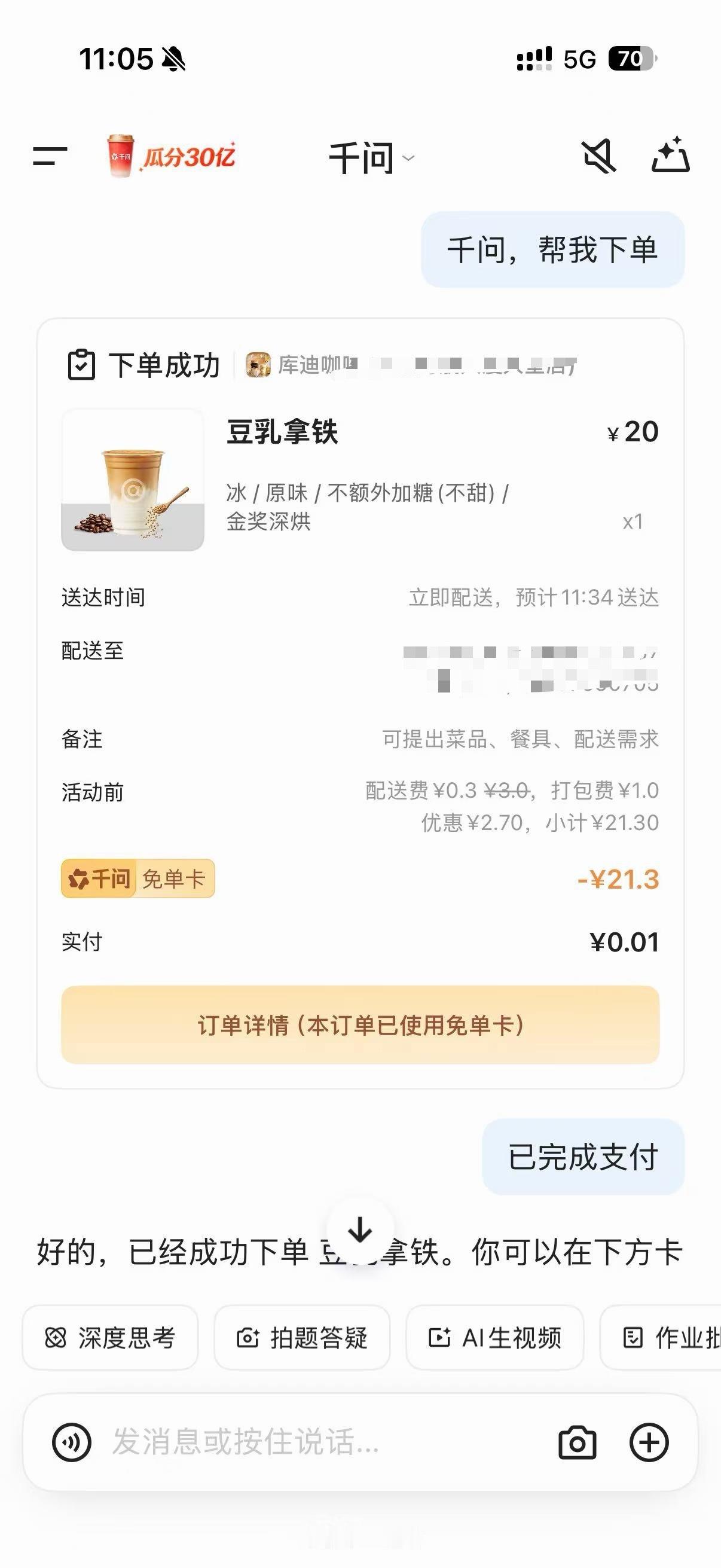 我直接用千问点了杯奶茶,还意外领到了一张25块的免单卡,抵扣完只要一分钱,超划算!想必大家应该都只知道千问送奶茶了,不知道除了奶茶,平时点小吃、买年货百货都能用,AI点单又方便又省钱,这波真的被千问拿捏了,亲测好用!