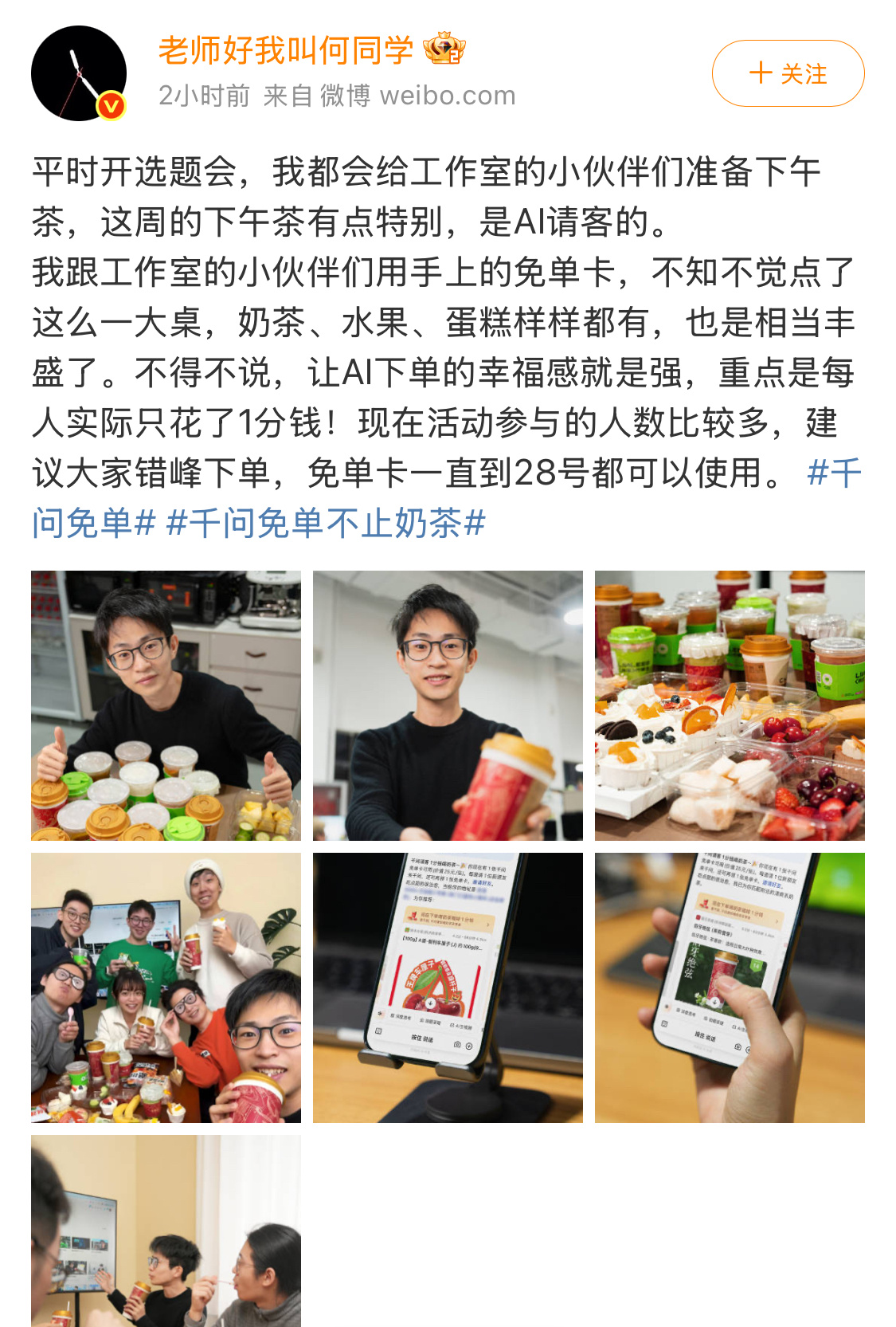 刚刚何同学发文,用千问给工作室的小伙伴们准备下午茶,十分感慨AI下单的幸福感就是强,重点是每人实际只花了1分钱。我也喝上了