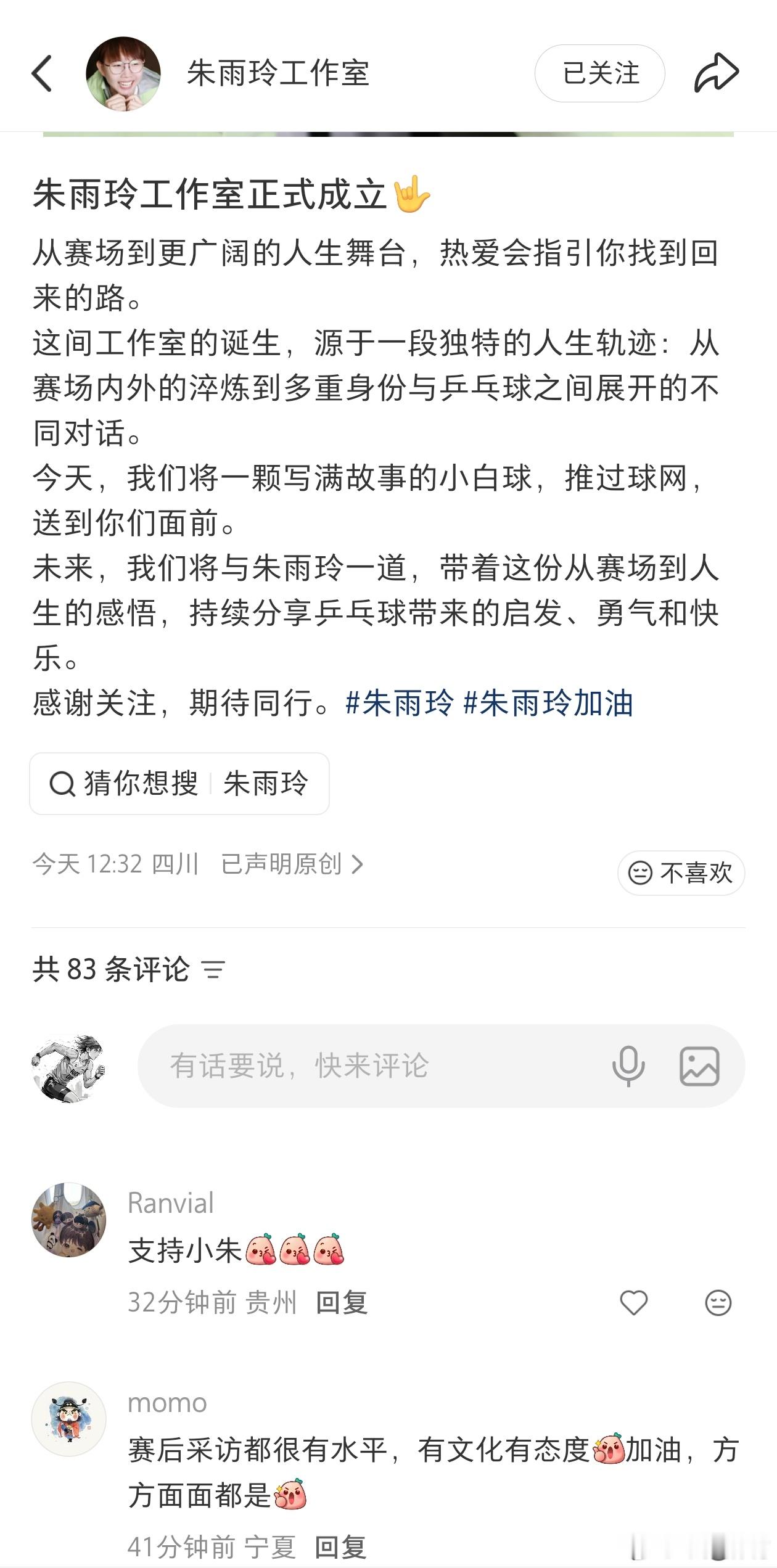 朱雨玲工作室原话: 朱雨玲工作室正式成立🤟从赛场到更广阔的人生舞台,热爱会指引你找到回来的路。这间工作室的诞生,源于一段独特的人生轨迹:从赛场内外的淬炼到多重身份与乒乓球之间展开的不同对话。今天,我们将一颗写满故事的小白球,推过球网,送到你们面前。未来,我们将与朱雨玲一道,带着这份从赛场到人生的感悟,持续分享乒乓球带来的启发、勇气和快乐。全网热点共创计划