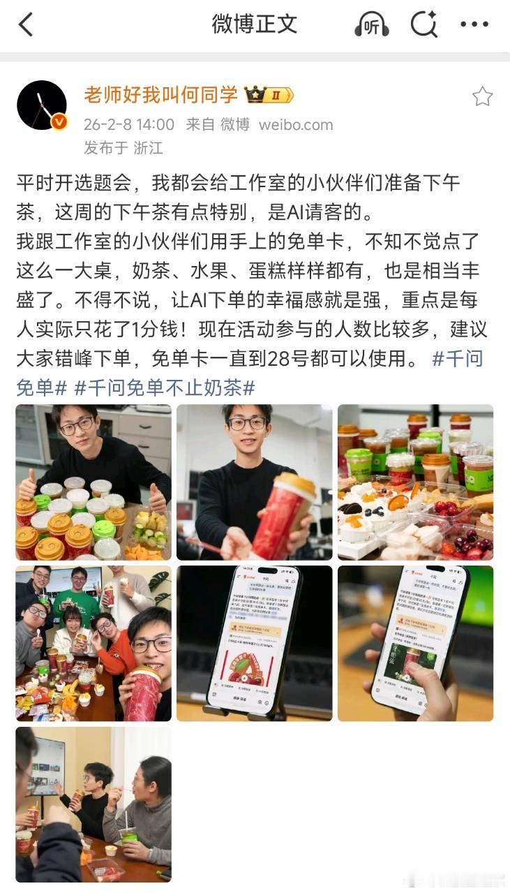 何同学谢谢AI请客 用AI点外卖这一招何同学算是玩明白了!直接用千问点了全公司的下午茶!已被成功安利,我也要去体验一下用千问点外卖,打开发现还领到了一张免单卡,马上就用它在天猫超市点了些零食了!而且不管是点喝的、吃的还是用的,点各种外卖都能用这个免单卡,现在邀请新用户两人还有机会各得一张,囤下来上天猫超市买年货也很划算!