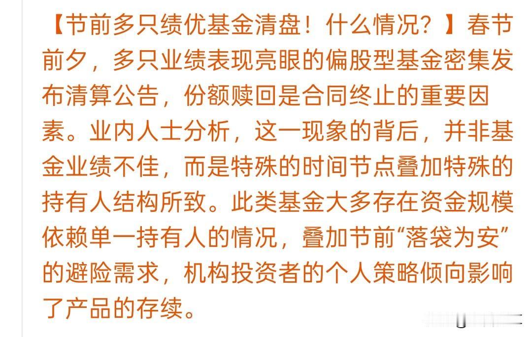 多只绩优基金清盘,2023年起国家队救市宣告结束 春节前夕,A股市场出现标志性转变:多只业绩出众的绩优基金密集发布清算公告,与此同时,摩根士丹利最新报告显示国家队已回吐2024年以来全部A股流入资金。这两大信号共同表明,自2023年10月开启的国家队救市周期正式终结。从精准托底到逐步离场,A股市场正告别政策资金的持续护持,步入由市场自身力量主导的全新阶段。 2023年四季度,A股深陷估值低谷与情绪萎靡的双重困局,沪指持续跌破3000点,市场陷入“下跌 - 减持”的恶性循环。在此情形下,以汇金、证金为核心的国家队启动了三轮精准救市,明确了“政策底”的坐标。2023年10月,汇金首次大规模增持四大行股票并加大宽基ETF投入,单月注入500亿元流动性,打破市场悲观预期;2024年2月,救市范围扩大至科创50、创业板ETF,引导资金流向新质生产力赛道;2025年4月,面对海外冲击引发的单日暴跌,国家队盘中紧急增持200亿元ETF,首次实现极端行情下的即时响应。三轮救市形成“蓝筹托底 + 成长突破”的配置格局,不仅使沪指触底反弹,更重塑了市场对政策的信心,成为A股摆脱低迷的关键支撑。 此次多只绩优基金清盘,并非业绩欠佳所致,而是市场资金结构与投资偏好转变的直接反映。这些清盘的集优基金大多业绩优异,但存在单一机构持有人占比超90%的特点,机构的投资决策直接决定基金存续。节前市场“落袋为安”的避险需求高涨,机构投资者风险偏好转向防御,巨额赎回成为清盘的直接诱因。这一现象背后,是市场资金对政策环境变化的敏锐察觉:当国家队从“单边支撑”转向“双边交易”,原本依赖政策托底的机构资金开始重新评估市场风险,集优基金的清盘潮,本质上是机构资金适应市场新阶段的调仓举动。 国家队的退场并非突发状况,而是市场化转型的必然结果。数据显示,自2026年1月中旬以来,国家队累计卖出约830亿美元A股股票,抹平2024年以来全部流入,2020年以来的累计净流入仅剩160亿美元。与此前单纯托底不同,当前国家队的操作更具市场化特点,在市场过热时抛售降温,为未来波动预留干预空间。而外资的持续回流,成为国家队退场后的重要支撑:2026年1月,美欧共同基金净流入中国股票86亿美元,主动型基金时隔三年首次转正,被动型基金流入规模升至74亿美元,外资对A股核心资产的配置需求,印证了市场自身吸引力正在恢复。 从救市结束到绩优基金清盘,A股市场的底层逻辑正发生深刻变革。过去三年,国家队通过“精准滴灌”的政策手段,完成了修复市场信心、筑牢估值底部的使命;而如今的调整,正是市场从“政策驱动”向“基本面驱动”回归的必由之路。集优基金清盘提醒投资者,未来需更关注基金的持有人结构与流动性风险;而国家队的市场化转型,则意味着A股将迎来更成熟的定价机制。 当然,市场转型期难免伴有波动,但此次国家队退场并未引发大幅调整,反而彰显出A股承接大规模卖盘的韧性。随着政策托底的消退,企业盈利增长与产业升级将成为市场核心驱动力,从小盘向大盘、从题材向质量的风格转换,将成为市场新主线。2023年以来的救市周期落幕,并非市场支撑的消失,而是A股走向成熟的标志,唯有适应市场化的新生态,才能在新一轮市场周期中把握机遇。 这波减持以银行、证券为代表的上证50、沪深300传统行业为主,其直接影响是为市场降温,传统大蓝筹调整幅度较大。接下来关注其何时退出科创和创业板,那大概率是牛市结束的标志之一。 最后,这次它们的退出,至少与强调的引导中长期资金入市有些相悖,难道所谓的中长期就是3年左右吗?