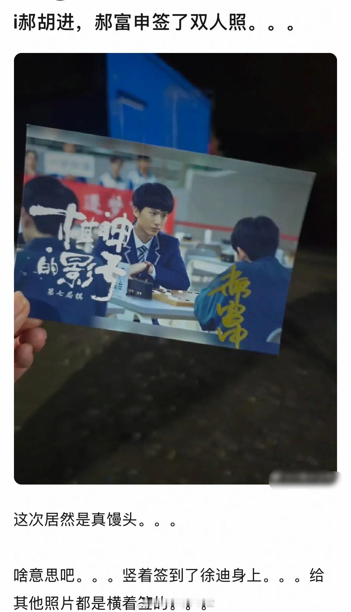 有粉丝晒了郝富申的签名照,郝富申签的正是郝富申与胡先煦的同框画面!要过年了,郝富申本人力挺……