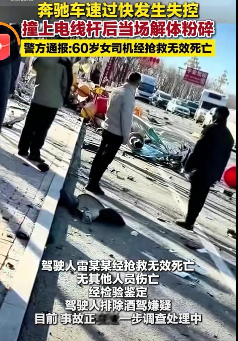 鄂尔多斯奔驰惨烈解体,60岁女司机殒命!这起悲剧敲醒所有驾驶人 十次事故九次快 2月3日,鄂尔多斯交警的一则通报,让全网揪紧了心。2月2日上午,东胜区东康快速路上,一辆奔驰轿车因车速过快失控,狠狠撞上路边路灯杆,车身当场解体粉碎,60岁女司机雷某某经全力抢救,最终还是没能挽回生命。离春节只剩十几天,一场意外,让一个家庭的团圆梦彻底破碎,现场散落的车辆残骸,更是看得人脊背发凉。 监控里的画面,每一帧都触目惊心:奔驰车如脱缰野马般冲出,撞击的瞬间发出巨响,车头与车尾直接分家,金属构件拧成一团,玻璃碎片、零件飞散一地,不看车标,根本认不出这曾是一辆豪华轿车。路过司机回忆,那声撞击震得耳朵嗡嗡响,上前查看时,只看到歪倒的路灯杆和变形的驾驶座,满心都是后怕。 警方通报排除了酒驾嫌疑,却让无数疑问涌上心头:为何豪华车撞杆会瞬间解体?60岁女司机的失控,是否与年龄相关?事发路段是否藏着安全隐患?网友的讨论瞬间炸开,有人质疑奔驰的安全性能,明明标榜着完善的安全系统,却扛不住一次高速撞击;也有人将矛头指向高龄驾驶,认为年纪大了反应变慢,不该在快速路开这么快;更有本地司机吐槽,事发的高架衔接段限速80却易打滑,路灯杆还没有吸能缓冲,本就是事故高发地。 可抛开这些争议,一个不争的事实摆在眼前:车速过快,是这场悲剧的核心诱因。“十次事故九次快”,这句被说烂的警示,在每一次惨烈事故中都被反复印证。时速的每一次飙升,都在为危险加码,哪怕是顶配的安全配置,在失控的速度面前,也可能不堪一击。这位60岁的女司机,或许只是一时疏忽,或许是对路况过于自信,却不料一步踏错,便是天人永隔。 这起事故从不是孤立的意外,而是给所有交通参与者的一记重锤。无论你是开了几十年的老司机,还是刚拿驾照的新手;无论开的是豪华车还是普通代步车,上路行驶,唯有将“慢一点”刻在心里,将敬畏规则放在首位,才能守住自己和家人的平安。冬季路面易滑,快速路车流密集,多一分谨慎,就少一分风险。 快过年了,世间所有的美好,都抵不过一句“平安到家”。愿逝者安息,也愿这起用生命换来的教训,能让每一位驾驶人警醒:方向盘握的是生命,脚下的油门,别踩得太急。你觉得这起事故中,最该反思的是什么?评论区说说你的看法,愿我们都能平安度过每一段旅程。