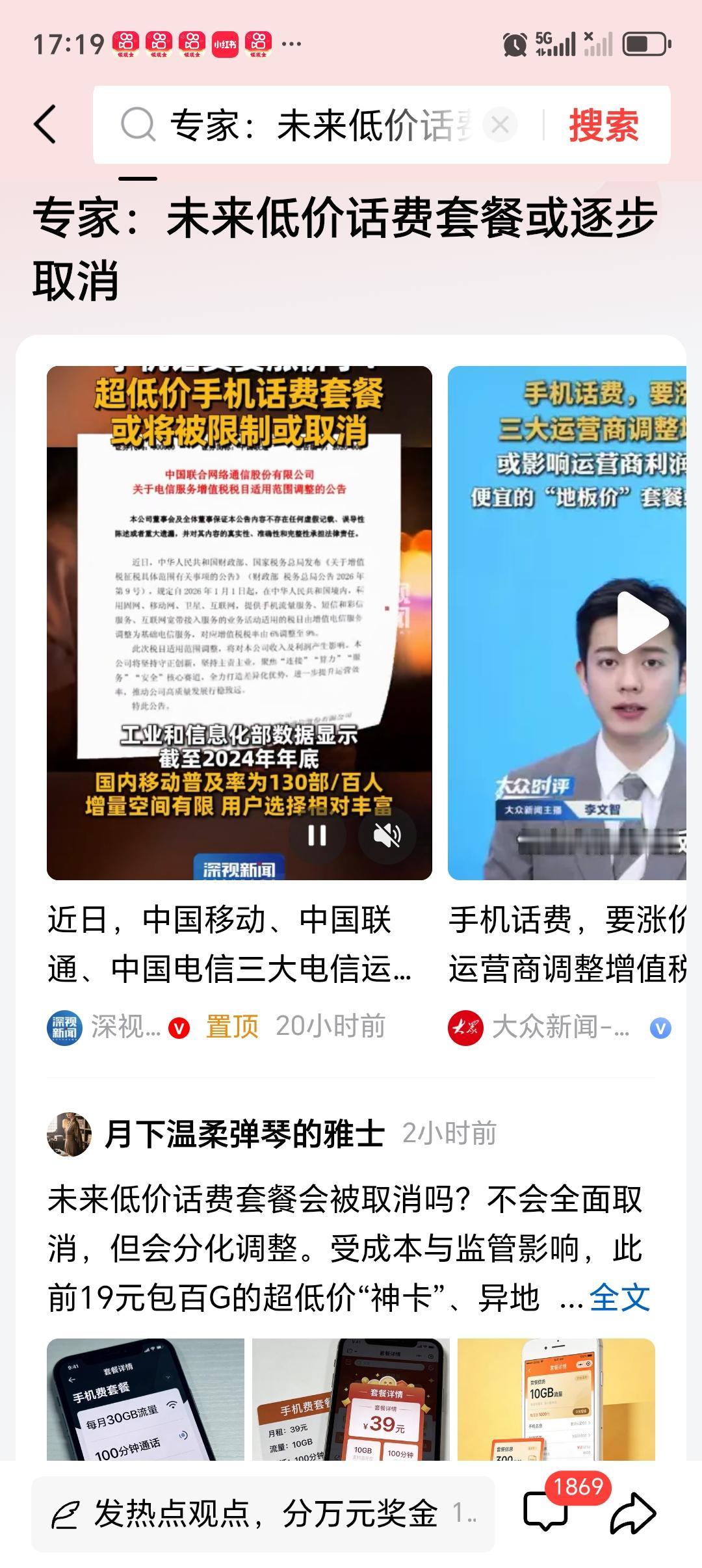 专家:未来低价话费套餐或逐步取消 专家说未来低价话费套餐或逐步取消,这消息听着就让人头大。现在大家生活成本这么高,低价套餐对很多人来说就是救命稻草,像我这种每月就打打电话、发发消息的,低价套餐完全够用,费用还低。要是都取消了,只能被迫选择更贵的套餐,这不是平白增加开支嘛。而且很多老年人,他们就用手机简单联络家人,低价套餐正合适。真不知道专家咋想的,光看运营商利益了,也不考虑考虑咱普通老百姓钱包受不受得了。