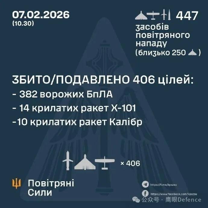 烽火问鼎计划 当地时间2月7日夜间到8日凌晨,俄军再次对乌克兰发动大规模空袭,根据乌克兰军方发布的战报,俄军本次空袭总计发射了408架自杀式无人机、2枚“锆石”高超音速导弹、21枚KH-101巡航导弹和16枚“口径”巡航导弹。乌克兰防空部队击落了其中的382架自杀式无人机、14枚KH-101和10枚“口径”,2枚“锆石”和其余的巡航导弹则并未被拦截,但其中两枚导弹的信息正在核实,疑似遭干扰或发生故障,看起来并未击中目标。