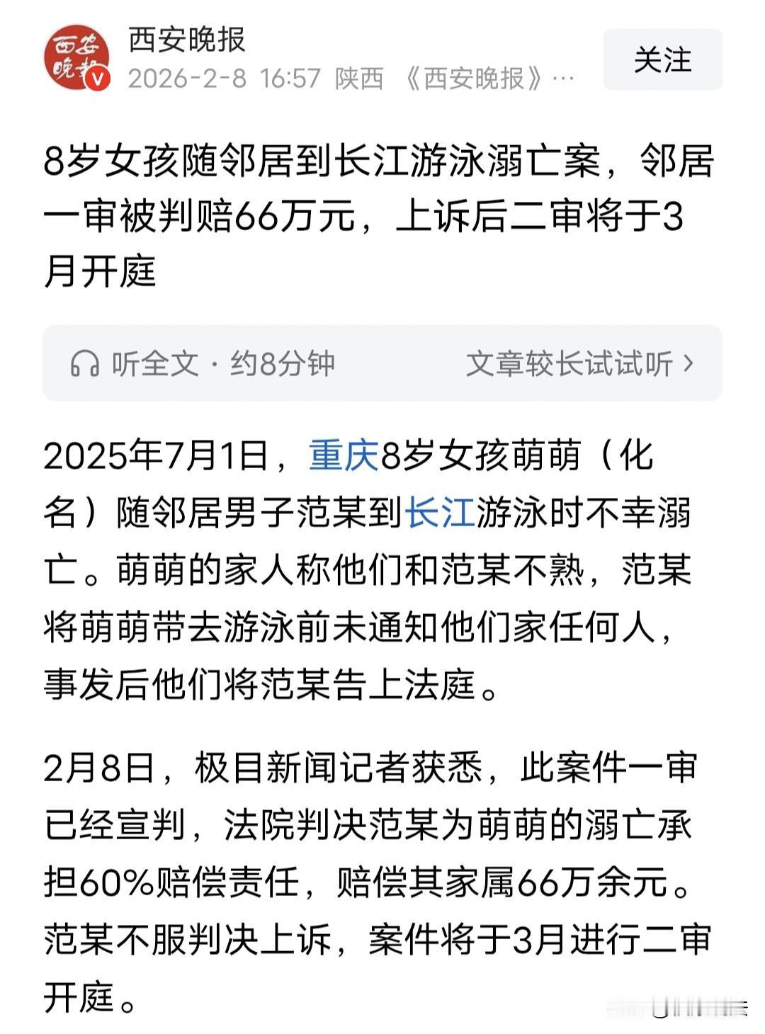 重庆,男子带着一儿一女去长江游泳,邻居家8岁小女孩硬要跟着去,男子本来不想带她,可见她穿了泳衣,心软了,没想到,到了长江游泳后,眼见小女孩被卷入趸船旁边的漩涡,男子赶去抓住她的手,却因水流湍急滑脱手了,结果小女孩不幸溺亡,男子游出来逃了一命,事后,小女孩家属认为男子只顾自己的儿女,没全力救其女儿,索赔109.556万元。法院判决令人意外。 范某这半年来肠子都悔青了,他怎么也没想到,原本是准备带自家娃去江边游泳玩,谁能想到惹上一桩命案,还赔出大半辈子的积蓄。 那天傍晚,范某正打算带一双儿女去长江边游个泳,凉快凉快。 邻居家的8岁女孩小萌看见了,非要跟着一起去。 范某当时嘴皮子都磨破了,一直和小萌说“不能去、太危险”,毕竟孩子小,家长又不在跟前。 可这小萌孩子主意大,自己跑回家换了泳衣,还回了范某家拿走了一套游泳圈和跟屁虫。 范某的女儿当时也没多想,还帮小萌遮遮掩掩地拎着装备。 等到了江边,范某看小萌装备齐全,潜意识里觉得她肯定会水,也就没再疾言厉色地把她撵走,心想顺便看一眼的事儿,结果这就埋下了祸根。 下水没多久,水流突然变急。 当时小萌离范某有点远,有人提醒他,你孩子有危险,他一看小萌瞬间被卷到了趸船旁边的漩涡里。 范某一看头皮都炸了,赶紧拼了命往过游。抓是抓住了小萌的手,可那江水的吸力大得吓人,他连自己都被拽进船底下了,好不容易才钻出来死里逃生,可小萌那孩子就这么没了。 范某本以为是救人未果,结果被小萌的妈妈孙女士告上法院,索赔109.556万元。 孙女士说,女儿小萌根本就不会游泳,范某就给了她一个游泳圈和一个跟屁虫,就这么让她下了水。 孙女士还说她从视频里看到,范某在江里主要顾着他自己的两个孩子,小萌离他们有一段距离。等小萌遇到危险,被卷进趸船旁边的漩涡里时,范某居然没有全力去救她。 等自己得到消息赶过去,只看到女儿小小的身体躺在那里,孙女士的心都碎了,感觉天都塌了下来。 孙女士觉得范某必须为自己女儿的死负责。 因为,范某没经过她们同意就带小萌去那么危险的地方游泳,还不好好照顾她。 这件事就是一层一层的疏忽叠到一起,才酿成了悲剧。 范某可能一开始确实不想带小萌去,架不住孩子跟着,心软就默认了。看到萌萌带着泳具,下意识觉得孩子会游,加上要顾自己两个娃,就没太上心。 后来出事时,他冲上去救人自己都差点被困,说他见死不救确实有点冤。但他错就错在“半推半就”,既然答应不了,就该强硬把小萌送回家,而不是放着她跟着去江边。 小萌的外婆也很无奈,老人年纪大了,不可能一直把孩子拴在身边,接不到小萌那8秒的电话可能刚在忙别的。但平时没给孩子讲清野泳的致命危险,事发时没留意孩子跑出去,监护的缺位也确实是悲剧的导火索。 最苦的还是小萌妈妈,好好的孩子去外婆家过个暑假,就再也回不来了,换谁都接受不了。 那么,法院会怎么判决呢? 根据《民法典》第1165条规定,行为人因过错侵害他人民事权益造成损害的,应当承担侵权责任。 在此事中,邻居范某带不会游泳的小萌去长江游泳,未充分尽到防范劝阻和安全保障义务,导致小萌溺亡,存在明显过错,需承担侵权赔偿责任。 法院结合实际情况,判定其承担60%责任,符合法律规定。 最终,法院判决:范某赔偿孙女士66万余元。 有人说,这66万不冤枉!你没知会家长,带着孩子去游泳?我亲外甥女没学会游泳的时候我都不敢带去游泳。她学会了,也要问过她爸妈,才敢带着去泳池。 还有人说,这种情况比较常见,正常情况哪怕大人凶那个小女孩一下,也不能同意其跟着一起下水,被判赔偿也不冤。 最后,重庆寒假亲子游 希望这件事能给所有人敲响警钟,家长要看好孩子,平时的安全教育不能少。 邻居之间帮忙也得考虑周全,在带孩子去别的地方时一定要提前征得家长同意,看护时也要尽到责任。 一审宣判后,范某对判决结果不满意,提出上诉,案件二审将于2026年3月开庭。 你觉得范某该不该赔偿66万呢? 图片来源于网络