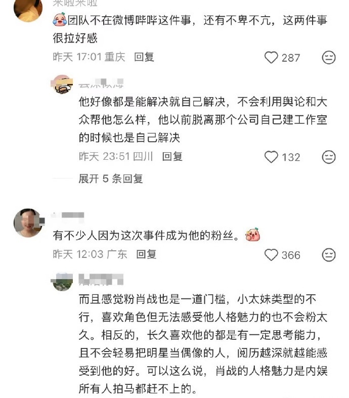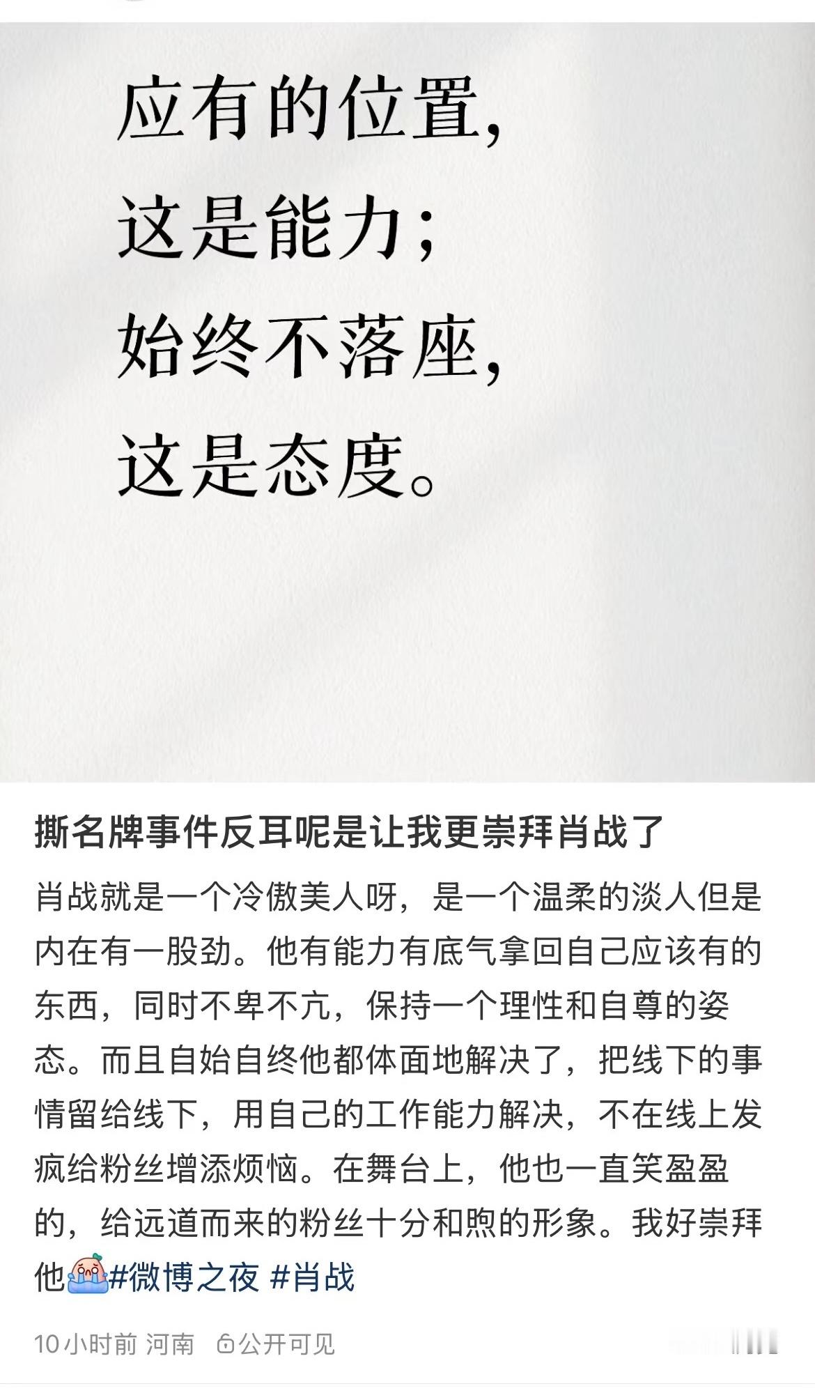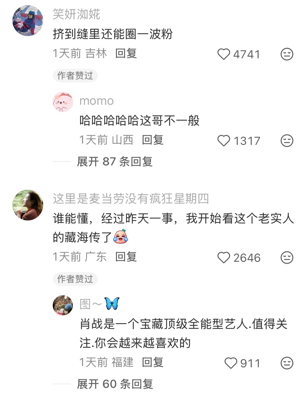 微博之夜座位事件后,第二个转粉肖战的高赞帖子来了,“微博之夜后,我好像突然粉上肖战了!!!”“挤到缝里还能圈一波粉”“我懂,我看了藏海传对他有好感但不想深入粉圈,昨晚彻底觉醒,保护欲一下子就上来了!” “不少人因为这次事件成为他的粉丝”“因为一件简单的事情透露出他的强大与刚强,冷感与迷人”
