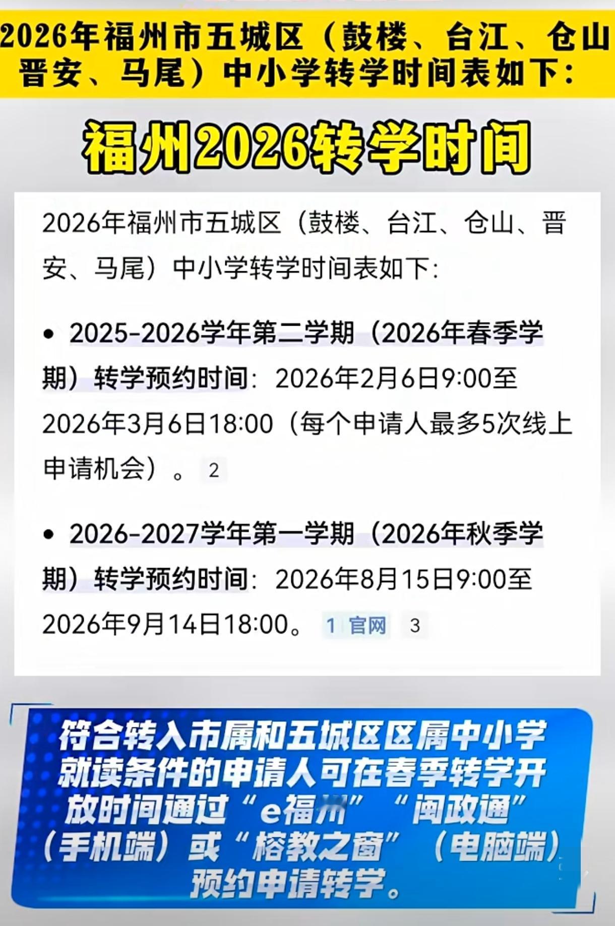 刚刚!福州市教育局发布重要公告!福州工作的外地家长有诉求:孩子、学生在乡下老家上学,户口也在地市乡下,想让孩子转学到福州五城区的任一学校,需要怎么走流程?提供哪些材料?回答:现在福州的随迁子女及其父母的居住地,实际已经跨省、市、区县、乡镇迁移(不含福州同城区内,比如鼓楼晋安台江等城区直接迁移)的,可以向教育主管部门申请转学。学生孩子户籍不在福州,属于跨省市迁移的随迁子女,在福州就读公办学校需提供父母双方的居住证。这是最新发布五城区中小学2025-2026学年第二学期转学工作的公告的内。家长有详细需求的,可以直接打福州市教育局咨询电话:83349431;鼓楼:87677955;台江:38105820,其它参考附图及网络上传方式。转学方法 小学转学政策 福建转学 转学申请流程 收藏并关注