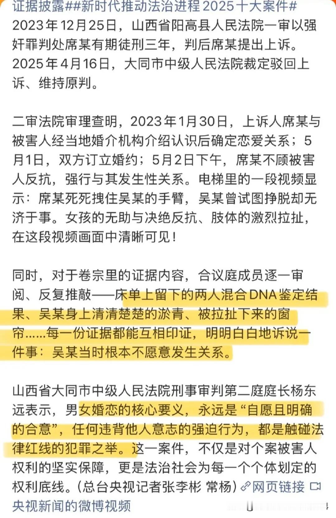 还记得山西“订婚强奸“案吗,今日其“电梯视频”首度曝光,网友纷纷直呼:判的好,这男的一点都不冤! 视频中,席某单手死死拽住女子的手臂,而女子为了不被拽走,蹲在地上奋力挣扎。奈何力气太小,最终被席某双手拖出电梯。 记得当时案发后,很多无良媒体乱带节奏,但就是不报道真相,反而不停强调“彩礼”“订婚”等等,再加上席某家属颠倒黑白,结果导致女子身为受害者, 却长久背负着种种骂名和网暴! 而男方席某23年12月一审被判三年后,却还没有悔悟继续上诉,直至25年4月被二审驳回、维持原判。 有网友说:三年了,视频曝光了,正常人都看得出来,女的就是不愿意。作为路人想说一句,不管订婚了还是结婚了,当中一方不愿意的时候,是不是应该理解尊重,而不是强行。例子就摆在眼前,人是高级动物,不是动物。 还有网友说,不管是已婚还是未婚,女性都有拒绝的权利!法院判的好,不被舆论裏挟,坚持法律公正! 小编则认为,男方当初觉得生米做成熟饭,女方会不敢伸张,明显就是拿女性普遍的“羞耻感”来拿捏女方!这很搞笑, 伤害是男方给的,还要女方去包容、承担!到底是谁该羞耻,是谁该承担处罚,相信法律已经给出了席某答案! 不管男女,尊重人权是最基本的法律准则!