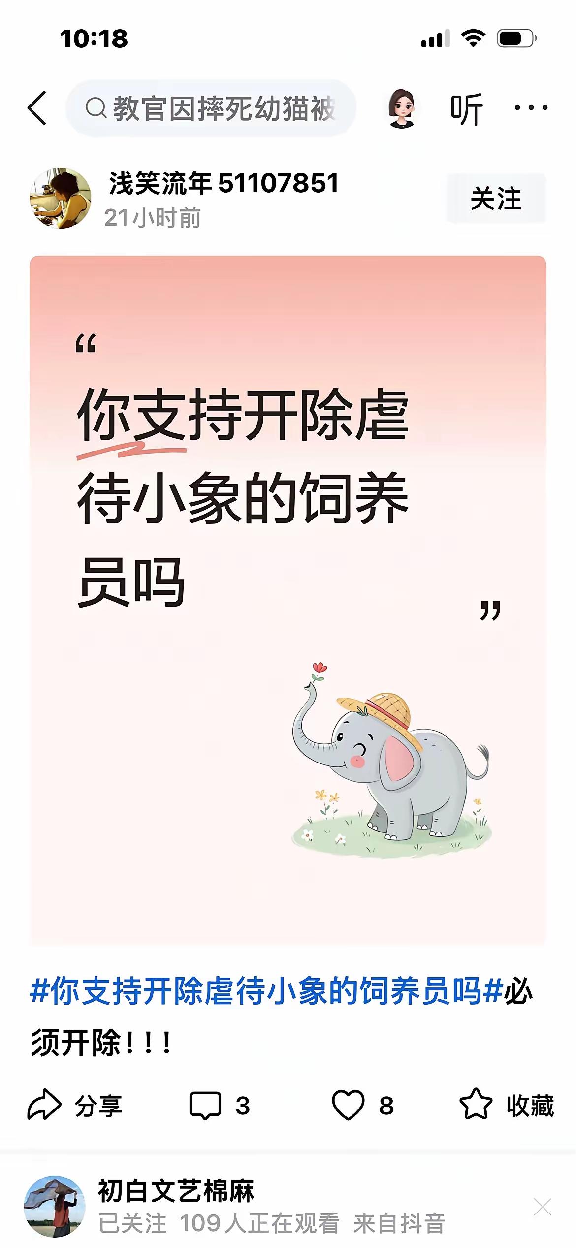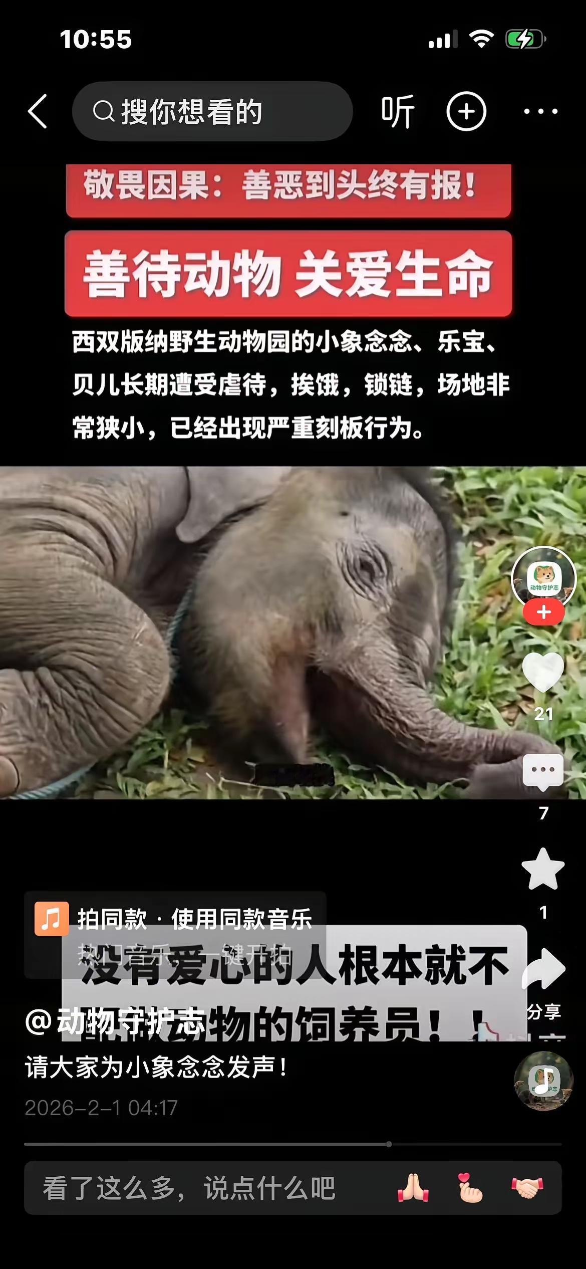 为了小象念念继续顶起!施暴者只是暂停工作没被开除,这根刺不拔,念念的恐惧就永远不会消失,哪怕现在能吃饱,看到熟悉的恶人,心里的阴影只会让它再次陷入不安!我始终觉得,对伤害动物的人绝不能姑息,停职只是暂时的妥协,不是真正的解决办法,私营企业更该有明确的底线,伤害动物的员工就该彻底清退,而不是留着让大家揪心。相关部门的一句监督太无力,没有实际的约束和处罚,所谓的整改不过是表面功夫。念念的平安不是靠一时的舆论关注,而是要靠长久的保障,我们持续发声,不只是为了让念念吃饱,更是为了让它能彻底摆脱恐惧,安心生活。大家觉得该怎么推动园方和相关部门给出实际的解决方案?