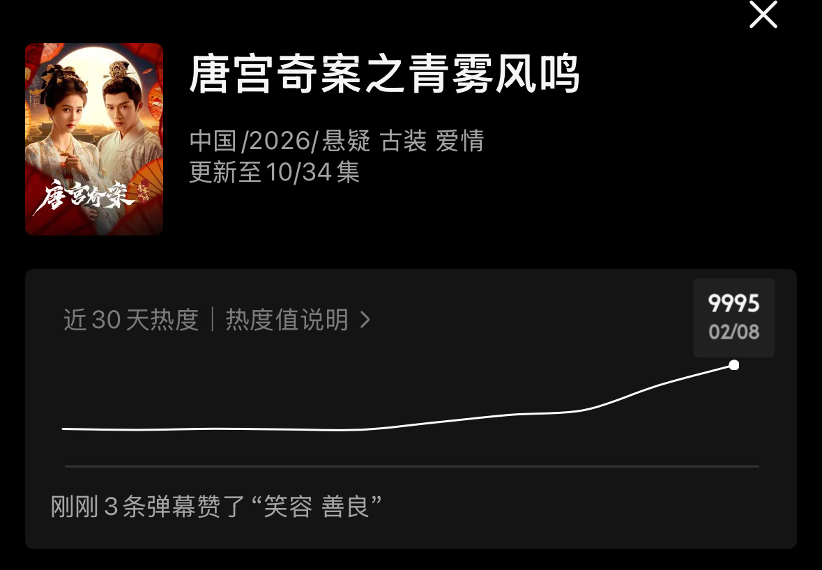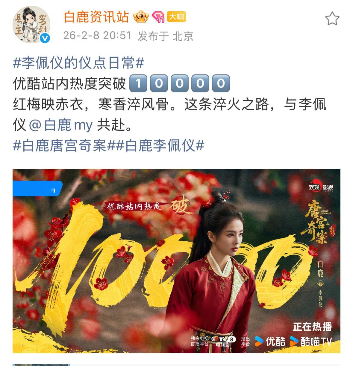 恭喜唐宫奇案优酷热度破10000🔥🔥🔥我只能说唐宫奇案值得 白鹿李佩仪值得 我们唐宫奇案也是壁上开花了 这个剧情这个节奏这个演技这个伏笔这个反转真的都让我我看的太爽了!!!破万了很棒但是依旧不能停 继续冲 优酷统计破万天数的!!!破万天数越多越好👊🏻给白鹿给唐宫奇案给李佩仪最好的好吗!! 唐宫奇案破万 /白鹿