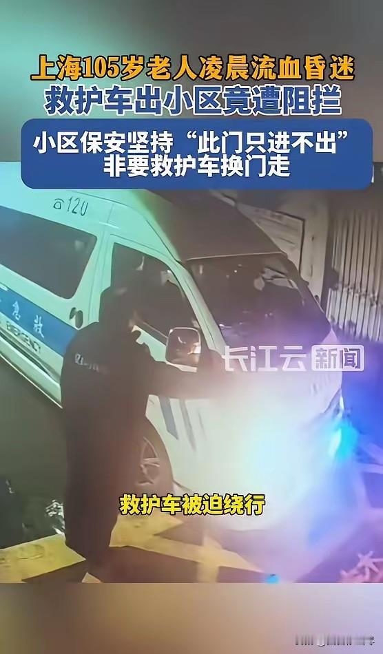 “必须严惩!”1月31日,上海,一105岁老人在家中摔倒,额头严重受伤,流血昏迷,在救护车运送过程中,因小区保安以“东门只进不出”为由,坚持让救护车换个门走,救护车只能绕行,被硬生生耽误5分钟!网友:拿着鸡毛当令箭! 1月31日凌晨两点,上海一处居民楼内,105岁的孟阿婆起夜时不慎脚下打滑,身体失去平衡后重重摔倒在地,额头恰好磕在木质桌角上,尖锐的棱角瞬间划破皮肤,鲜血顺着脸颊不断涌出,很快浸湿了衣领。 家属被突如其来的声响惊醒,开灯后看到老人满脸是血、双目紧闭,已经陷入深度昏迷,慌乱中立刻拨通120急救电话,守在老人身边不停呼唤,每一秒都在煎熬中度过。 急救中心接到求助后,迅速调度就近的急救车辆和医护人员赶往现场,十分钟左右,救护车便抵达小区楼下。 医护人员携带急救设备快步上楼,对老人进行初步检查,发现老人额头伤口较深,出血量较大,且意识完全丧失,存在颅内出血的潜在风险,必须立即送往医院进行专业救治。 考虑到老人年事已高,身体机能较弱,医护人员与家属分工协作,小心翼翼地将老人从五楼抬下,平稳放置在救护车内的担架上,全程尽量保持平稳,避免晃动加重伤情。 为了最大程度节省抢救时间,救护车司机选择从距离最近的东门驶出小区,这条路线是前往医院的最优路径,能减少至少十分钟的路程。 当救护车闪烁着急救灯光缓缓驶至东门口时,道闸杆始终处于关闭状态,当班保安站在门岗内,没有任何放行的动作。 救护车司机鸣笛示意,同时摇下车窗示意开门,保安却只是摆手,坚持告知东门只进不出,要求救护车更换出口通行。 医护人员见状,立刻下车向保安说明情况,强调车上是105岁的重伤昏迷老人,每一分钟的延误都可能危及生命,希望能特事特办。 家属也焦急地向保安解释老人的伤情,恳请其手动抬杆放行。但保安始终没有松口,既没有尝试操作电脑系统开门,也没有拿出备用钥匙或手动摇杆开启道闸,只是反复强调小区的通行规定,不肯做出变通。 在僵持了片刻后,为了不耽误老人救治,救护车司机只能无奈倒车,在狭窄的小区道路上缓慢掉头,沿着内部主干道绕行至南门。 从东门掉头到南门驶出,整个过程耗时五分钟,对于头部受伤、失血昏迷的百岁老人而言,这五分钟的每一秒都至关重要,家属全程紧握双手,内心充满焦虑与担忧,生怕延误带来无法挽回的后果。 救护车顺利驶出小区后,一路疾驰赶往医院,抵达后立刻被送入急诊抢救室。医护人员迅速为老人进行伤口止血、缝合处理,同时安排头颅CT等全面检查,排查颅内损伤情况。 经过数小时的紧急救治,检查结果显示老人没有出现颅内出血等严重并发症,只是额头留下了长达七厘米的裂伤,生命体征逐渐平稳,脱离了生命危险。后续老人转入普通病房休养,身体状况慢慢好转,最终顺利出院回到家中静养。 事件发生后,小区物业方面针对此事做出回应,明确表示小区管理规定中明确,救护车、消防车等特种车辆在执行紧急任务时,不受常规通行限制,门岗工作人员应立即无条件放行。 当班保安则解释称,事发时门禁的电脑操作系统和遥控钥匙同时出现故障,无法正常开启道闸,并非故意阻拦。 物业工作人员表示,已第一时间联系专业技术人员对门禁系统进行全面检修,排查故障原因并完成修复,同时将加强对全体工作人员的应急处置培训,完善紧急情况下的通行预案,明确手动抬杆、应急钥匙使用等操作流程,确保生命通道时刻畅通。 对此,你们有什么看法,欢迎评论留言~