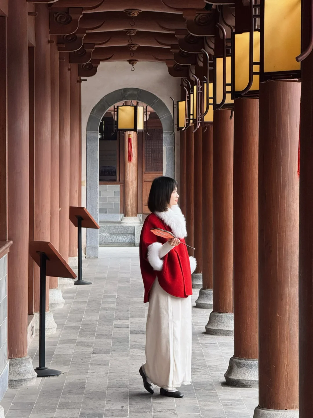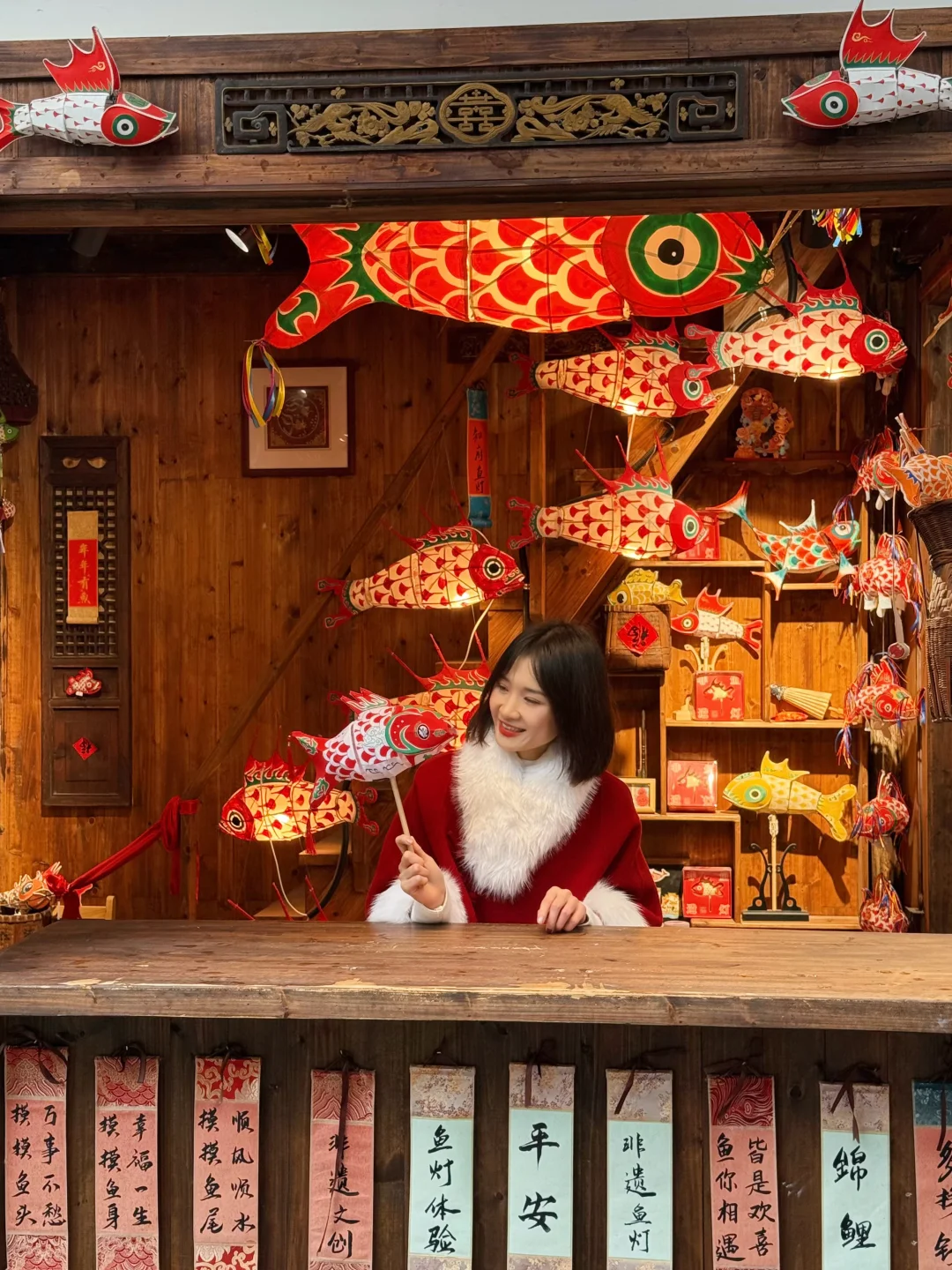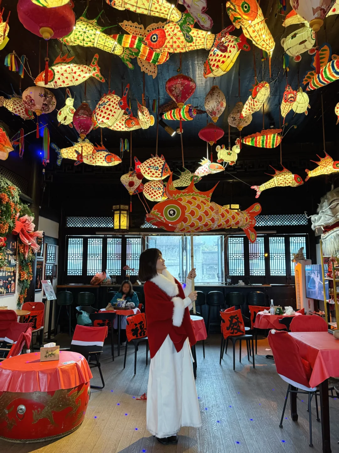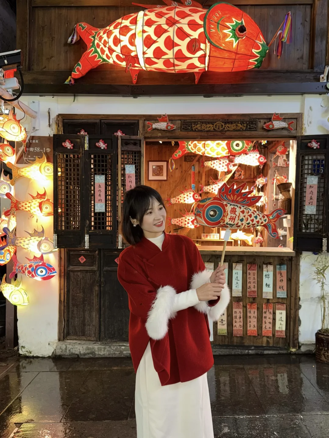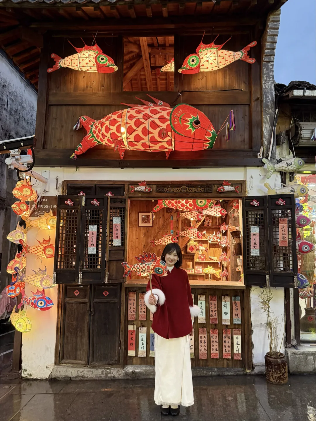 门口挂满鱼灯,新年氛围感拉满,傍晚亮灯会更出片。