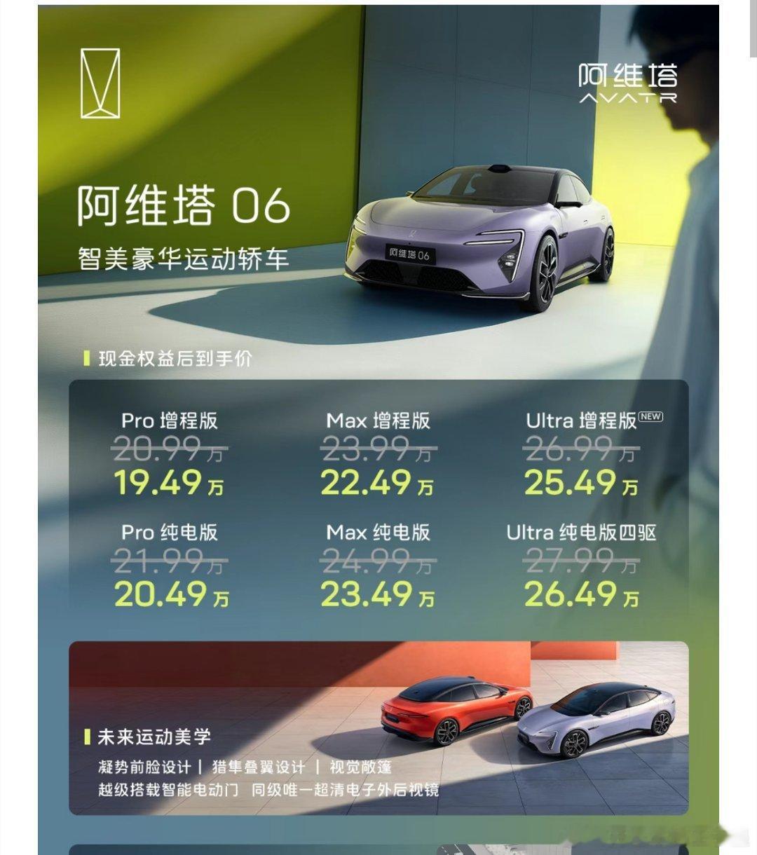 阿维塔06发布的正式价格Pro 增程 19.49万Pro 纯电 20.49万Max 增程 22.49万Max 纯电 23.49万Ultra 增程 25.49万Ultra 纯电 26.49万