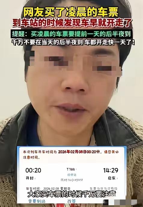 笑死个人!一男子买2月8号凌晨12点20的车票,愣是8号当晚才去候车,等半天没动静一问工作人员, 车早开走一天了,男子当场懵圈!评论区一堆网友直呼同款迷糊,原来真有大把人搞不懂这个凌晨时间的门道。 其实答案特简单,车票的24小时制里,8号凌晨12点20,就是7号深夜要去候车,这跨零点的车次,坑的就是没仔细看时间的人。 生活里大家习惯说晚上12点,却忽略了铁路系统的时间规则,一个小疏忽,不仅错过车,还白搭了车票钱。 说到底出门在外还是要多上点心,尤其是春运这种关键时候,看清票面的日期和时间真的太重要, 别让这种低级失误耽误了行程。你有没有过看错时间耽误事的迷糊经历?