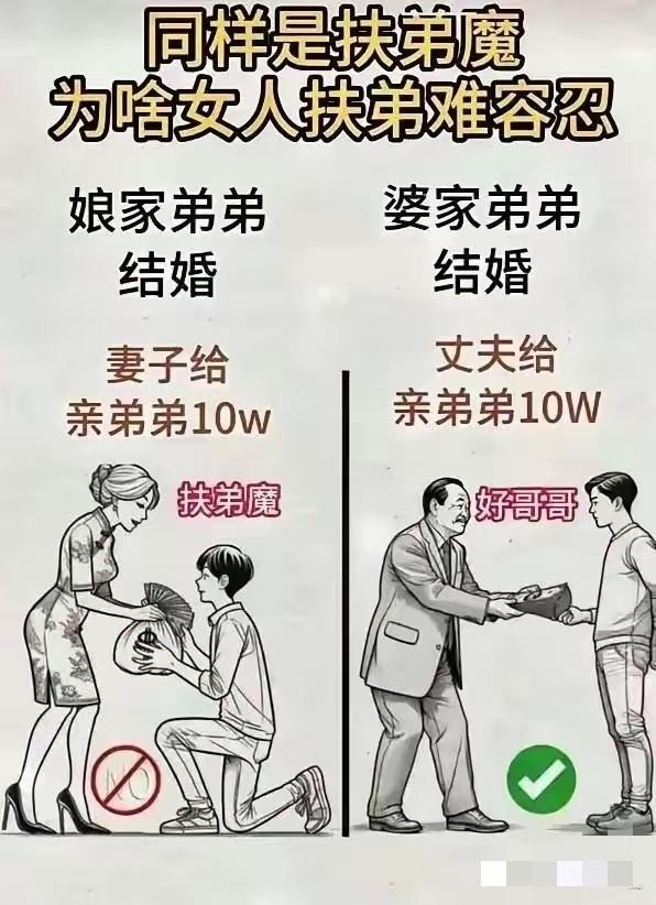 同样是扶弟魔,为啥女人扶弟就遭人诟病,男人帮弟却被默许? 这背后的双标,戳中了太多婚姻里的现实!网友的话一针见血,多数家庭默认女人的收入是婆家共同财产, 拿婆家的钱贴补娘家弟弟,自然被抵触;而男人帮弟,却被归为“自家人互相帮衬”,理直气壮。 更关键的是,帮扶的方式天差地别,男人帮弟大多有分寸,是力所能及的理智相助;不少女人扶弟却不计后果,掏空自己甚至小家,毫无底线的付出才让人反感。 说到底,大家反感的从不是“扶弟”本身,而是无底线的贴补和婚姻里的利益失衡,也反感这份根深蒂固的性别双标。自己挣的钱量力帮衬, 没人会说什么,可拿小家的幸福去填娘家的坑,谁都无法容忍。你怎么看待这种扶弟的性别双标?