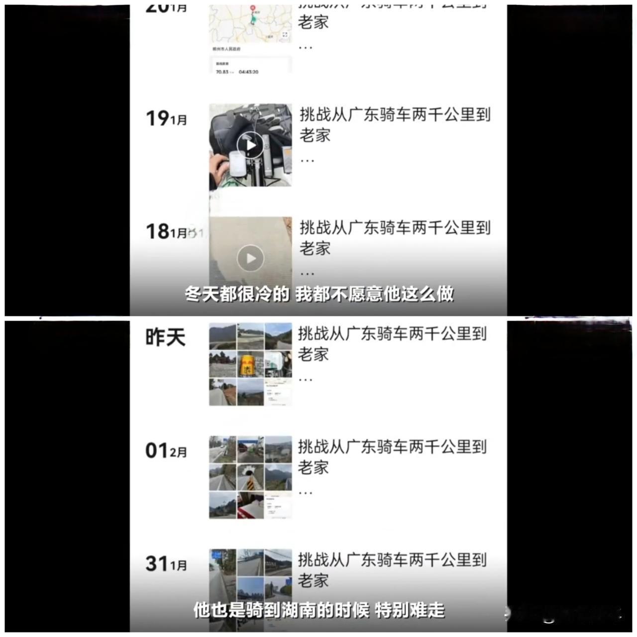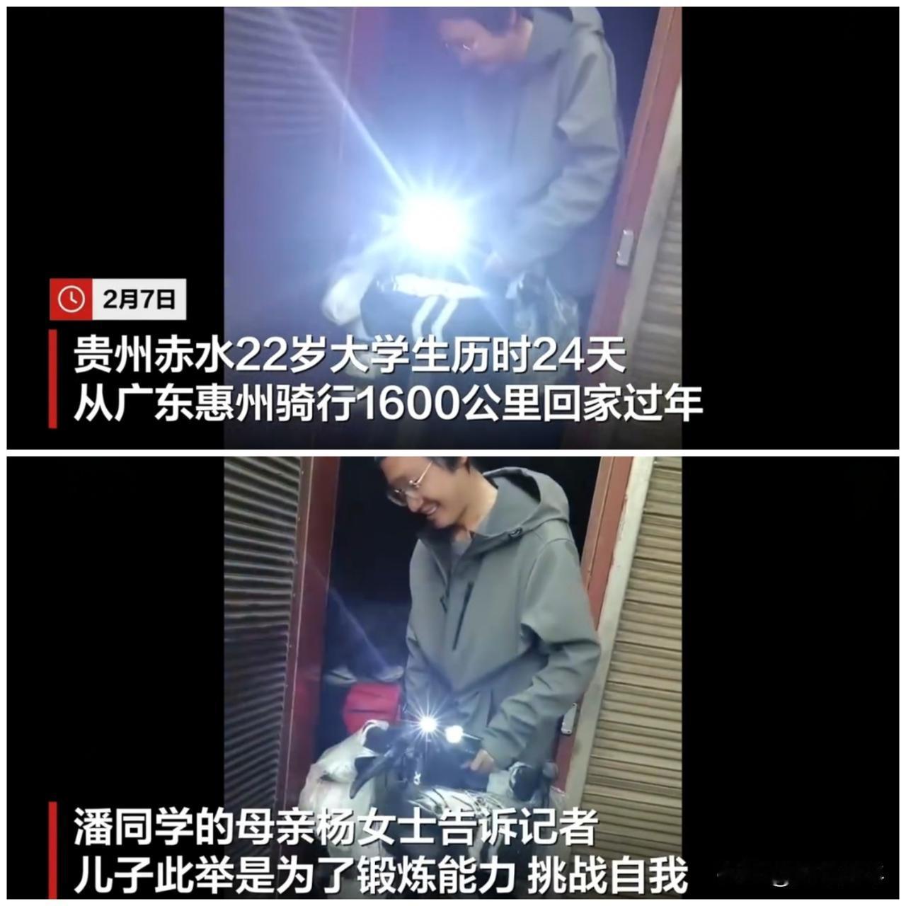 贵州的“土牛”(俗称)。[赞][作揖] 贵州一名22岁大学生耗时24天骑行1600多公里从广东惠州回到赤水老家过年。母亲最初明确反对此计划,担忧安全问题,但看到儿子完成挑战后转为骄傲。 很佩服该大学生的体力和毅力,从广东惠州到贵州赤水,以坚定的初心对抗疲惫与枯燥,把回家的心愿化作日复一日的坚持。以青春之躯扛住1600多公里的骑行征程,20余天风雨兼程,翻山越岭不曾退缩。日均骑行约80公里,面对爆胎、陡坡困难没有放弃,体现了体力和毅力的双重突破。 这趟旅程是当代年轻人反抗“躺平”的精神体现,他们不再满足于按部就班的生活。这种敢于打破常规、追求真实体验的精神,正是这个时代平凡人缺乏的东西。这个小伙子最打动人的地方,不是他骑了1600公里,而是他用一种特别的方式,给“回家过年”赋予了新的意义。贵州土牛