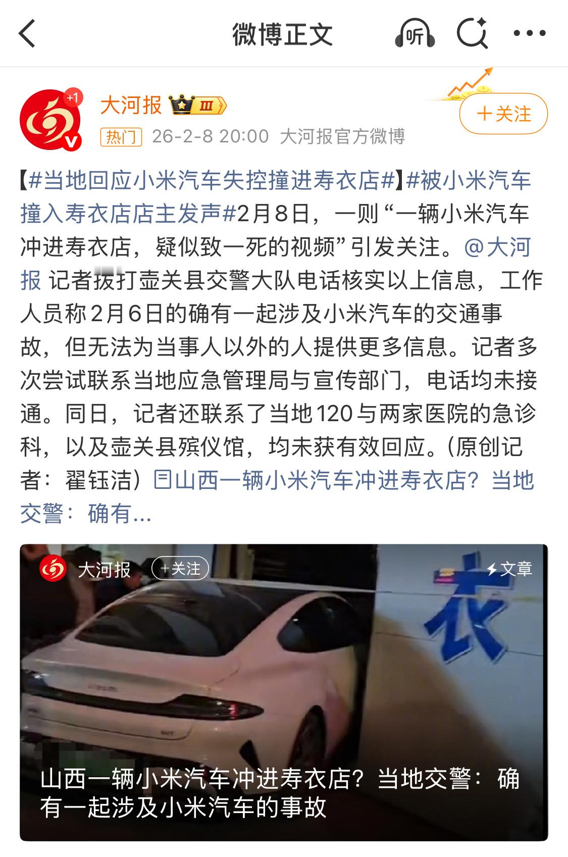 当地回应小米汽车失控撞进寿衣店快过年了,这是没新闻发了