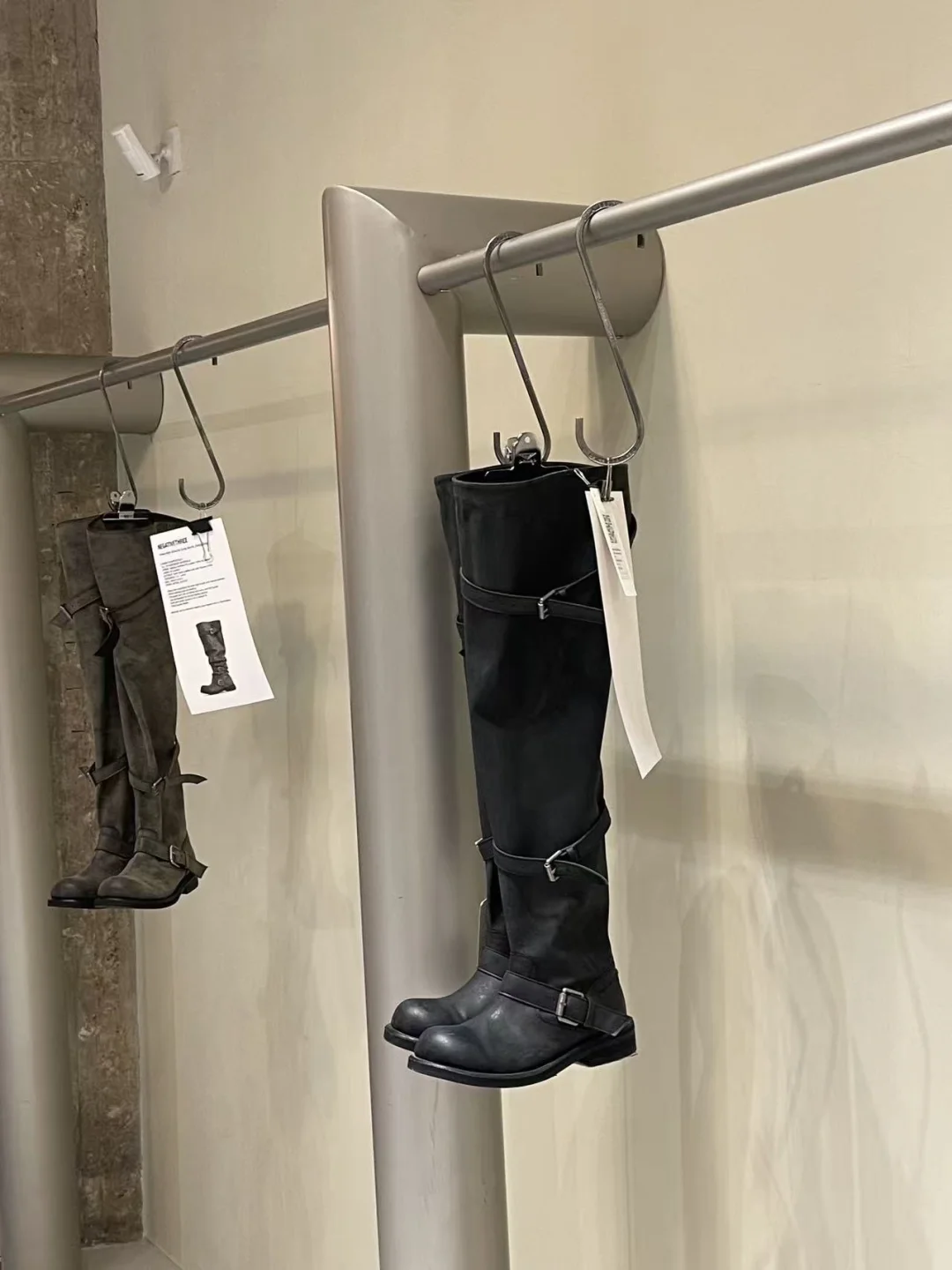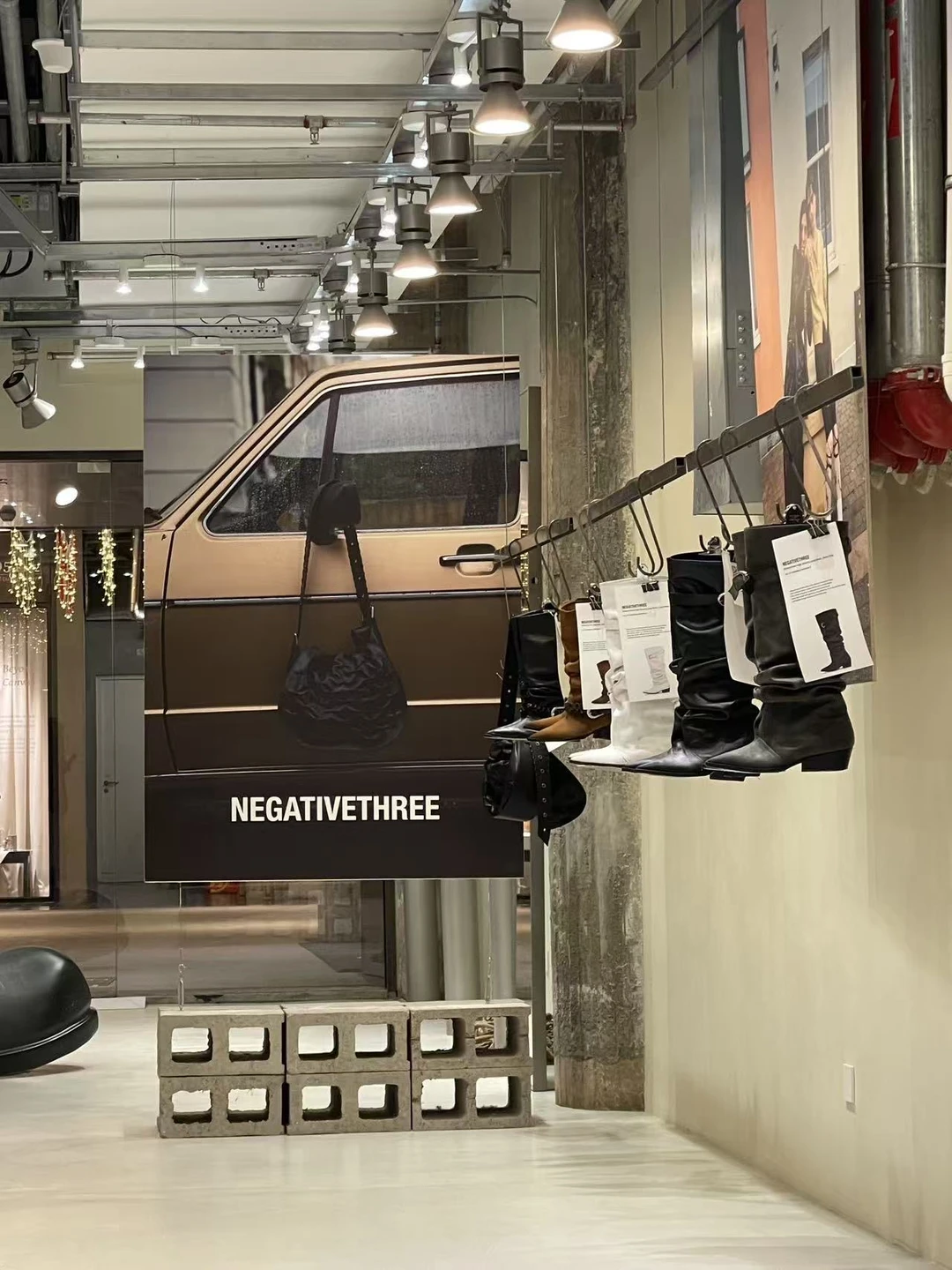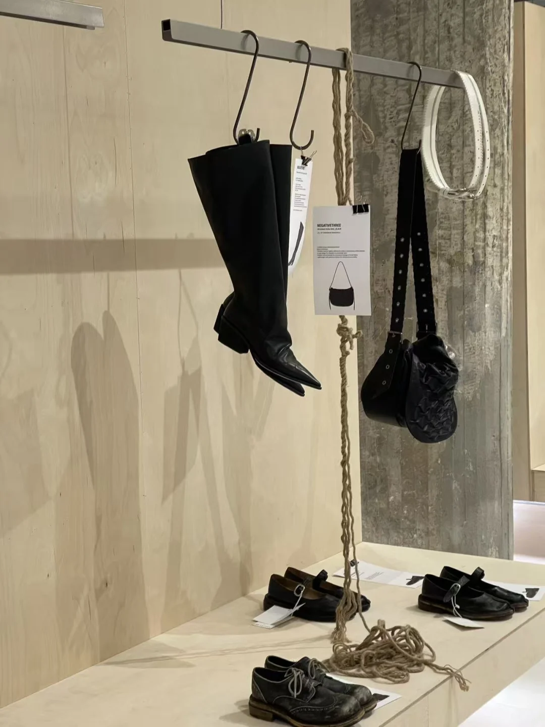 水泥肌理的墙面,利落的线条,暖而不燥的灯光,把每一件单品的质感都衬得淋漓尽致。一楼主要是极简风的CE RRIC还有张元英同款negativethree靴子。