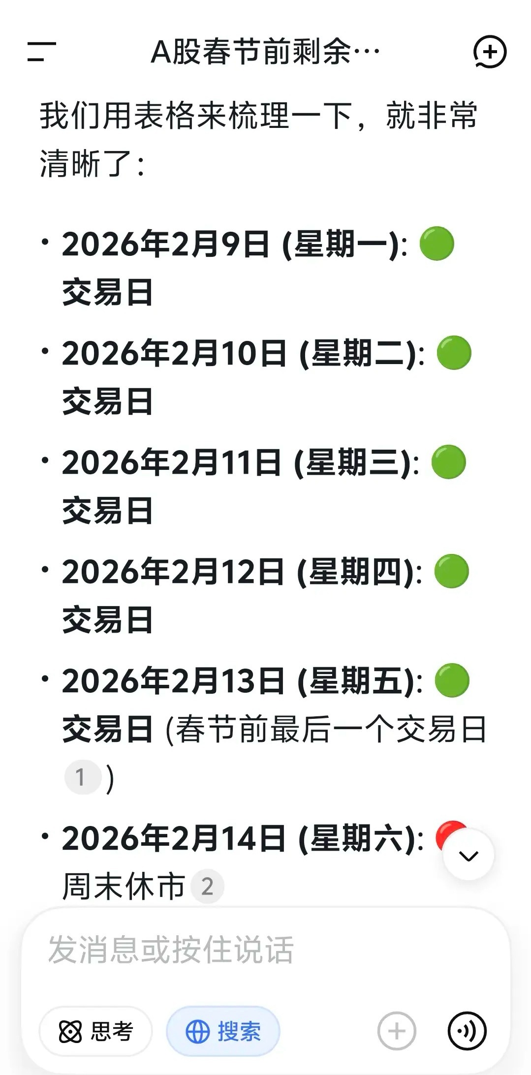 持股还是持币过年? 距离春节已经只有五个交易日了,持股还是持币过节,需要在2月12日(星期四)下午3点前作出决定了。因为到了星期五,即使卖出股票,也取不出现金了。 我认为,持股还是持币过年,完全取决于市场。拉升就持币过节,打压就持股过年。不变的是持股再多也不超过八成、再少也不低于三成。