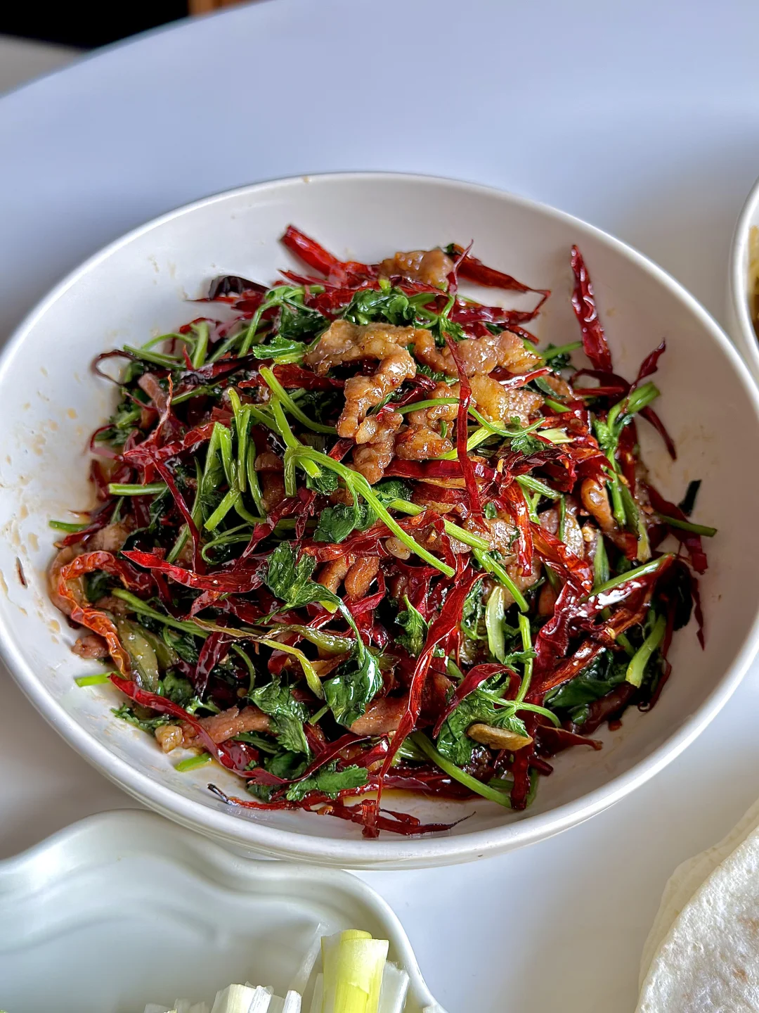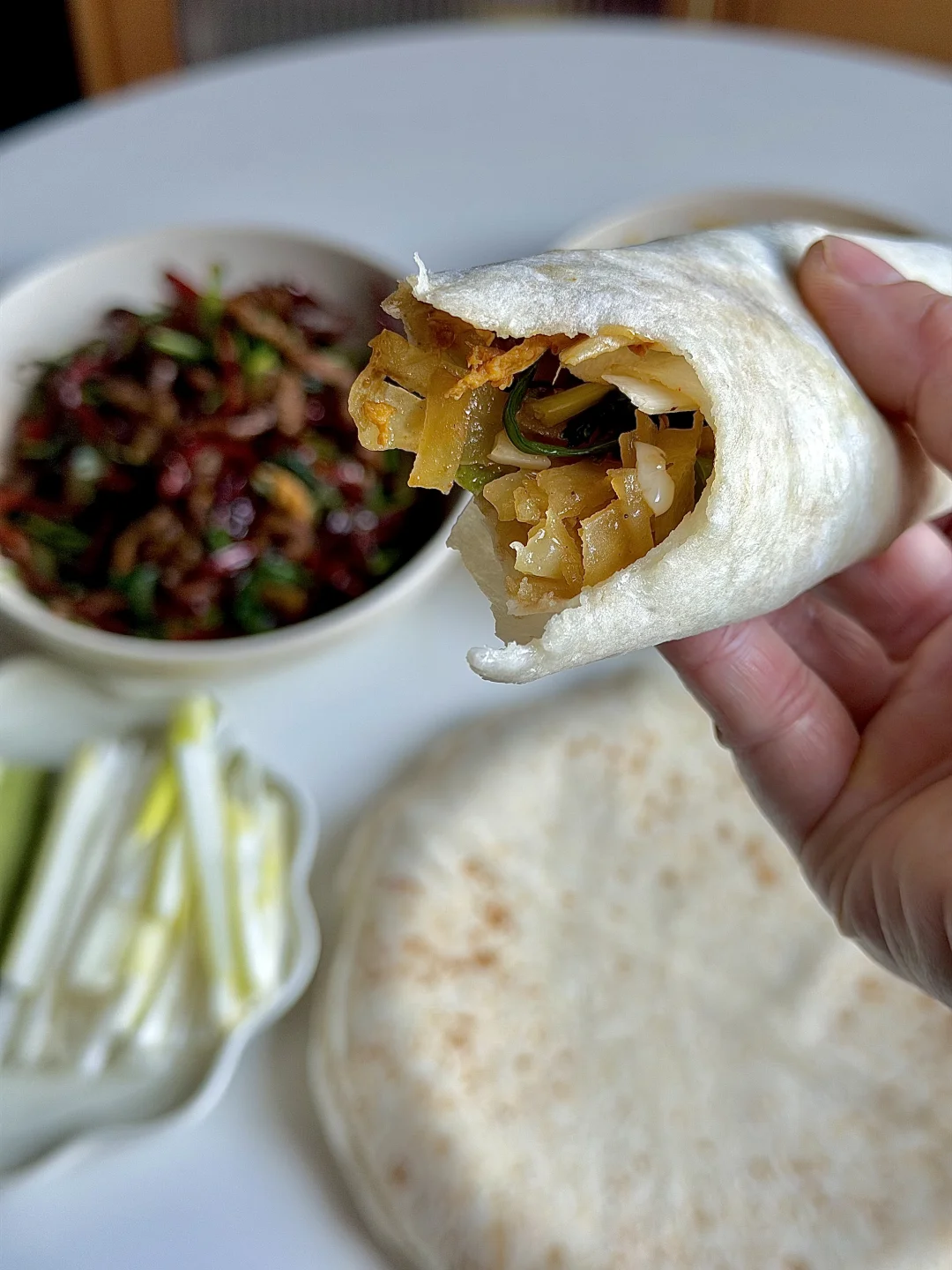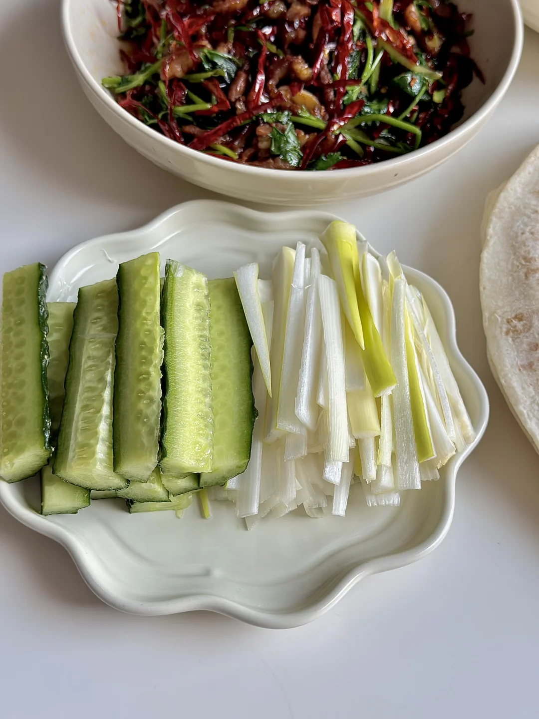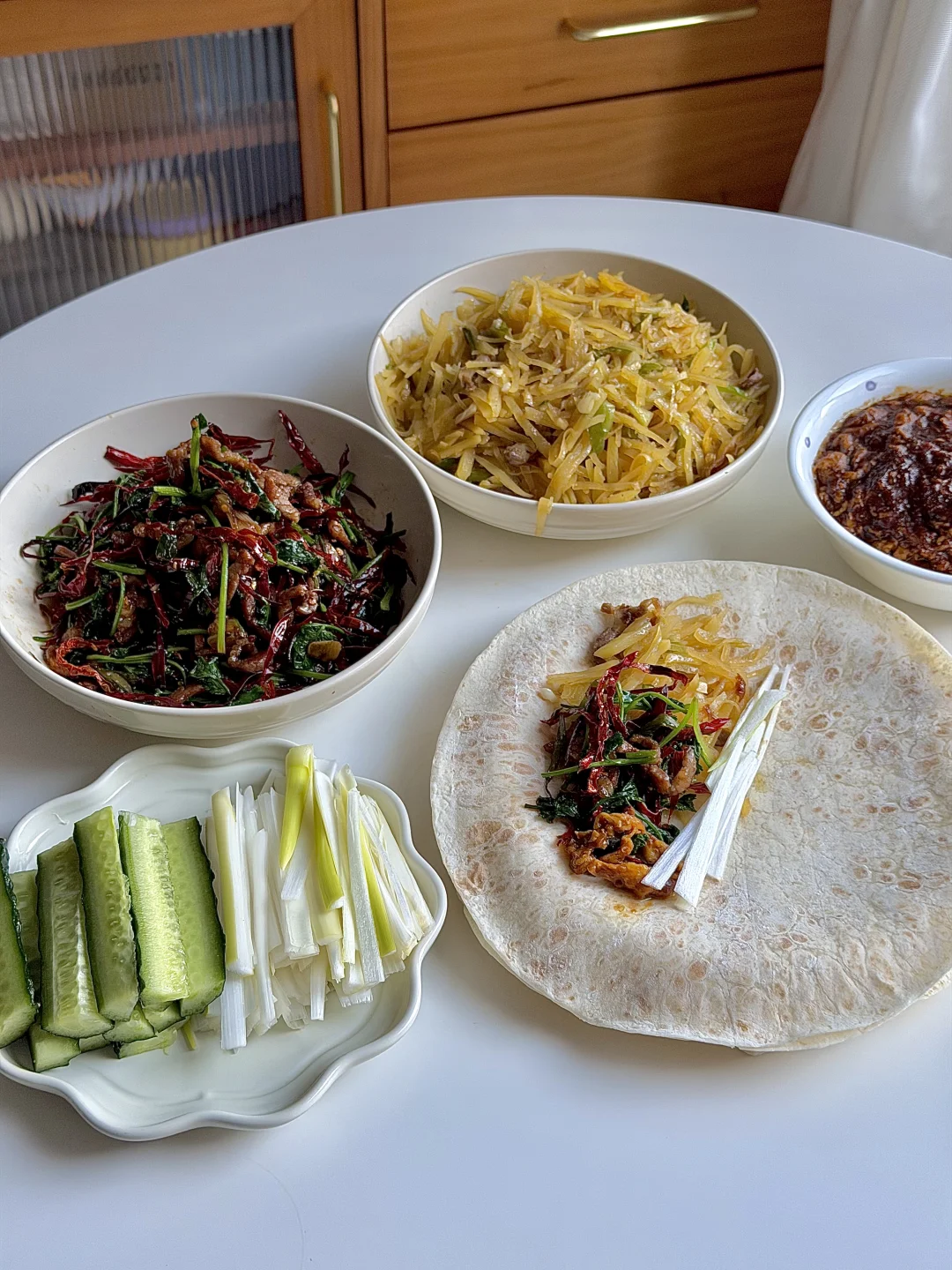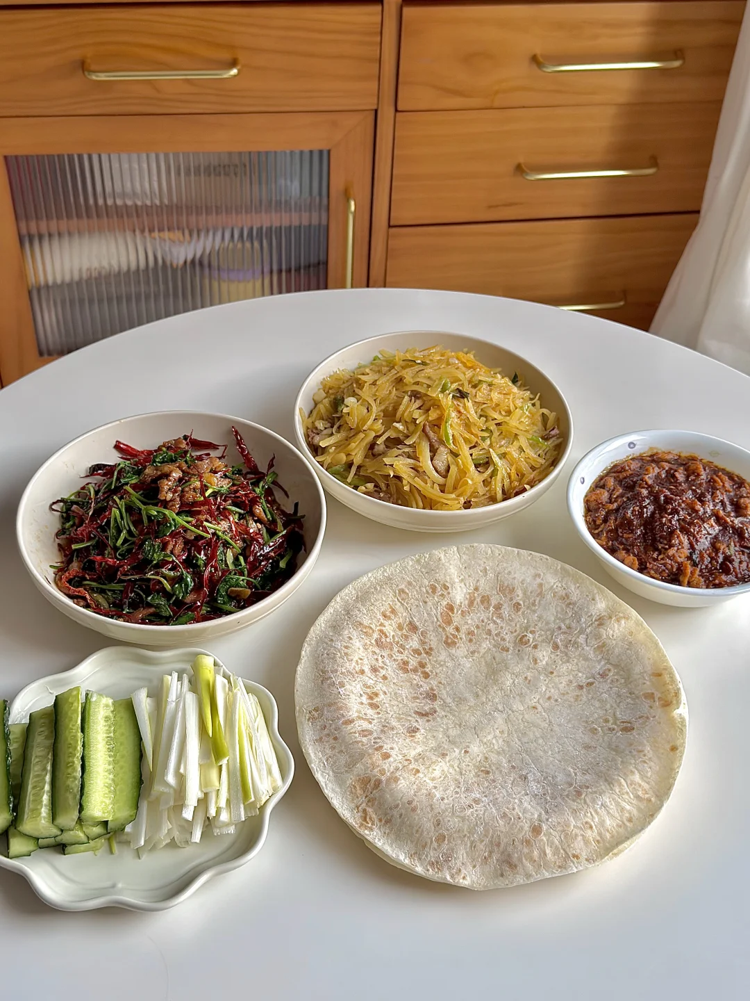 今日份美食分享: 春饼卷 土豆丝 香辣肉丝 鸡蛋酱 葱丝 黄瓜🥒 . 立春吃春饼,主要为了“咬春” 迎接春天的到来,新的一年一切顺利~ . 自己炒了两个喜欢卷春饼的菜 春饼是现成的,很方便! 大家记得要吃春饼哦!