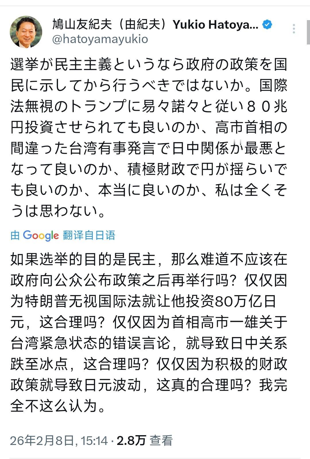 日本前首相鸠山由纪夫今天(2月8日)写道:“如果选举真的是民主的体现,难道不应该在向国民明确政府政策之后再进行吗? 我们真的可以默许政府在无视国际法的特朗普面前唯命是从,白白投入80万亿日元吗? 真的能接受高市首相在台湾问题上的错误言论,让日中关系恶化到谷底吗?真的可以任由积极财政政策导致日元汇率动荡不安吗?真的可以吗?我绝不这么认为。” 谁能想到,堂堂一个主权国家,竟然会在特朗普面前唯命是从,心甘情愿掏出 80 万亿日元白白打水漂,这笔钱折合成人民币差不多 3.5 万亿,是多少日本纳税人的血汗钱! 为了迎合特朗普,日本早前就答应要对美投融资 5500 亿美元,折合日元足足 85 万亿,比鸠山提到的 80 万亿还要多,可这笔天文数字的投入,日本连一点话语权都没有,项目遴选全由美方主导,最终决定权更是攥在特朗普手里,日本说白了就是花钱买 “跟从”,毫无主权可言。 更让人无法接受的是,高市早苗为了迎合右翼势力、抱紧美国大腿,竟敢在台湾问题上玩火,口出狂言把中日关系推到谷底,她的所作所为,简直是祸国殃民! 2025 年 11 月,她公然在国会宣称大陆对台动武可能构成日本的 “存亡危机事态”,还鼓吹荒谬的 “台湾地位未定论”,甚至窜访台湾搞所谓的安全合作,完全背弃了一个中国原则,忘了中日联合声明里的郑重承诺,把台海局势搅得乌烟瘴气。 她的这些错误言论,中方当即提出最严正交涉,可她不仅拒不撤回,还一意孤行,最终的苦果,全让日本普通民众咽了下去。 中方提醒公民避免赴日,各大航司免费退改日本航线,中国游客占日本入境消费的五分之一,这下大量旅游订单取消,旅行社、酒店、餐饮行业直接停摆,光旅游业一年就给日本造成 2.2 万亿日元损失,GDP 硬生生少了 0.36%。 水产品出口更是惨不忍睹,中国本是日本海鲜最大出口地,占了近 42% 的份额,暂停进口后,北海道的扇贝、海参养殖户血本无归,水产相关行业一年损失超 1100 亿日元。 要知道,中国是日本最大的贸易伙伴,2024 年中日贸易额高达 3083 亿美元,日本的汽车、半导体等产业高度依赖中国市场。 中日关系恶化后,这些产业的在华订单大幅锐减,数万亿日元的损失摆在眼前,高市早苗却只顾自己的政治私利,把日本的经济利益当赌注,这样的首相,哪里是在治理国家,分明是在把日本往绝路上带! 而日本政府所谓的积极财政政策,更是彻头彻尾的饮鸩止渴,最终让日元汇率动荡不安,老百姓的日子苦不堪言。 为了支撑媚美扩军的巨额开支,日本政府搞了 21.3 万亿日元的经济刺激计划,靠疯狂发国债填财政窟窿,如今日本的政府债务已经达到 GDP 的 2.5 倍,是世界主要经济体里最高的,这样的财政状况,早就岌岌可危。 恶果很快就显现,日元汇率一路暴跌,现在 1 日元也就兑 0.044 元人民币,贬值直接导致日本的进口物价飞涨,日本的能源、粮食大多靠进口,物价涨了,老百姓的生活成本跟着飙升。 2025 年 10 月,日本的核心消费价格指数同比涨了 3%,大米价格涨了 40% 多,5 公斤装的大米卖到快 200 元人民币,鸡蛋也涨了 13.6%,超过 99% 的日本人都直呼物价压力扛不住,可工资却迟迟不涨,实际收入越来越低。 一边是老龄化、少子化问题日益严重,养老金、医疗资源捉襟见肘,一边是政府把钱花在对外搞对抗、讨好美国上,看着民众连吃口平价大米都成了奢望,却视而不见,这样的积极财政政策,哪里是在救经济,分明是把日本经济往火坑里推,把普通民众逼上绝路! 鸠山由纪夫还质问,选举若是民主的体现,为何不先向国民明确政策,这话更是问到了点子上。如今的日本选举,早就成了政客们的政治秀,谁更媚美、谁更对华强硬,谁就能获得右翼支持。 高市早苗甚至不惜解散众议院,想靠大选巩固自己的地位,可这些政客从来不敢跟国民说清,跟着美国搞对抗要花多少钱,牺牲多少经济利益。 所谓的民主选举,早就成了空架子,国民的知情权、话语权被完全无视,这哪里是民主,分明是赤裸裸的政治投机! 鸠山的每一个质问,都戳中了日本政坛的痛处,在这样一个右翼当道、是非不分的环境里,他能坚守底线,尊重国际法,把国家利益和民生放在首位,这样的理性声音,太珍贵了。 日本政府若是还有一点清醒,就该听听鸠山的质问,听听民众的呼声,别再盲从美国、别再在台湾问题上玩火、别再无视民生疾苦,否则,最终只会让日本陷入更深的危机,搬起石头砸自己的脚!