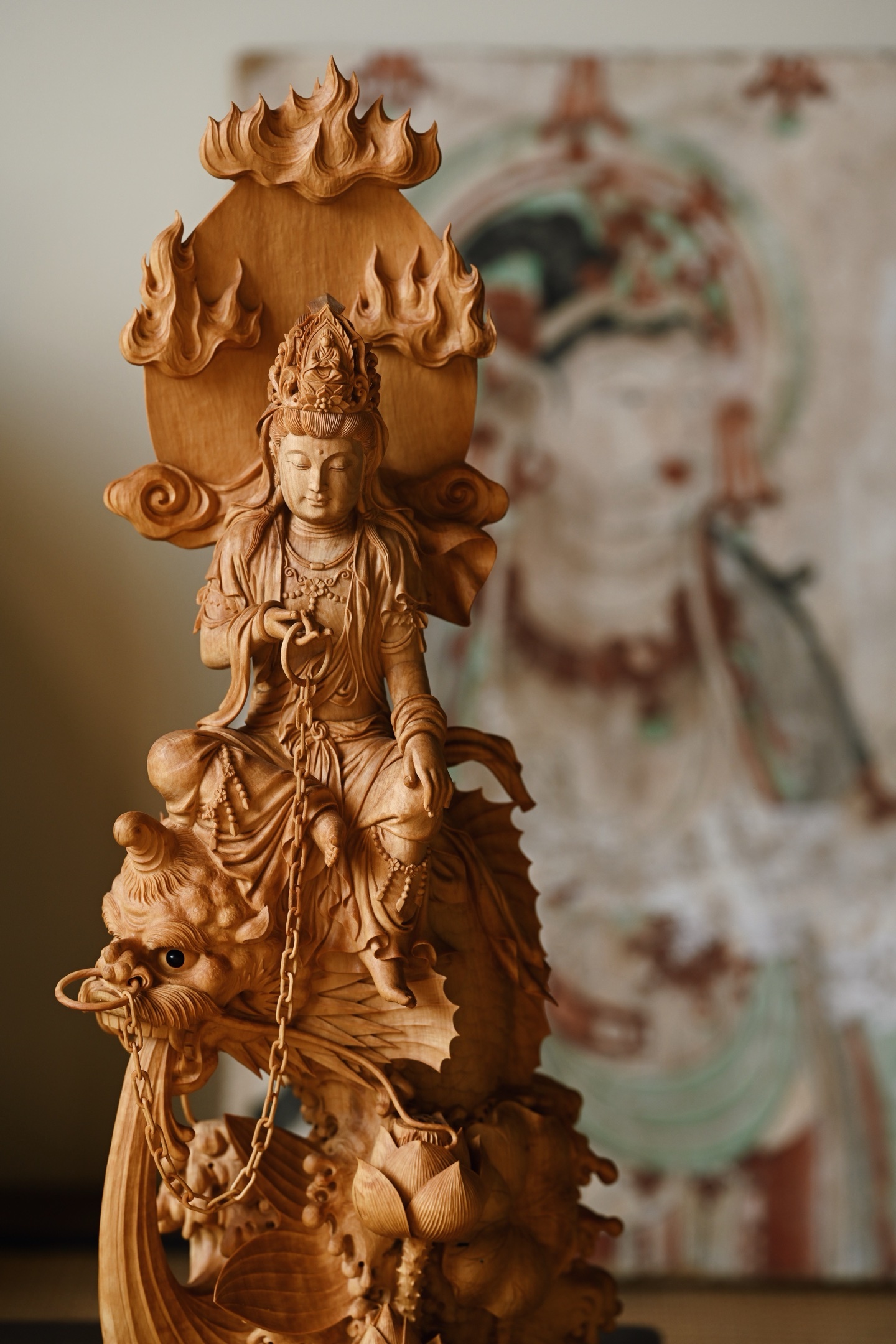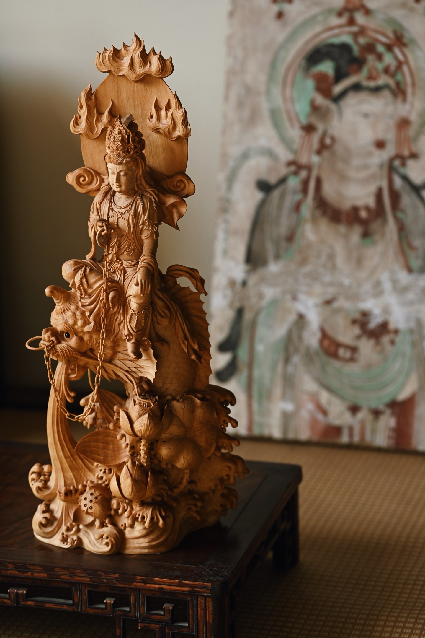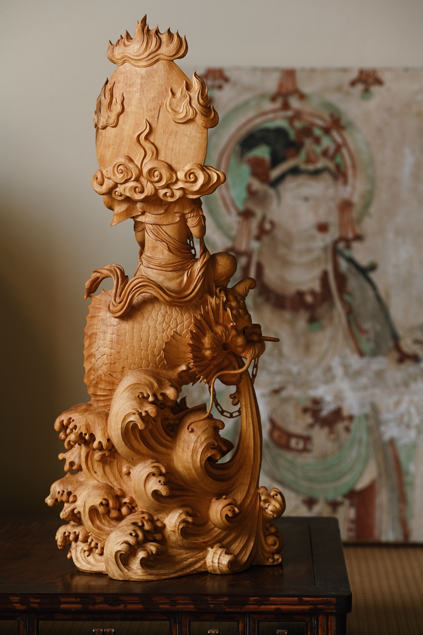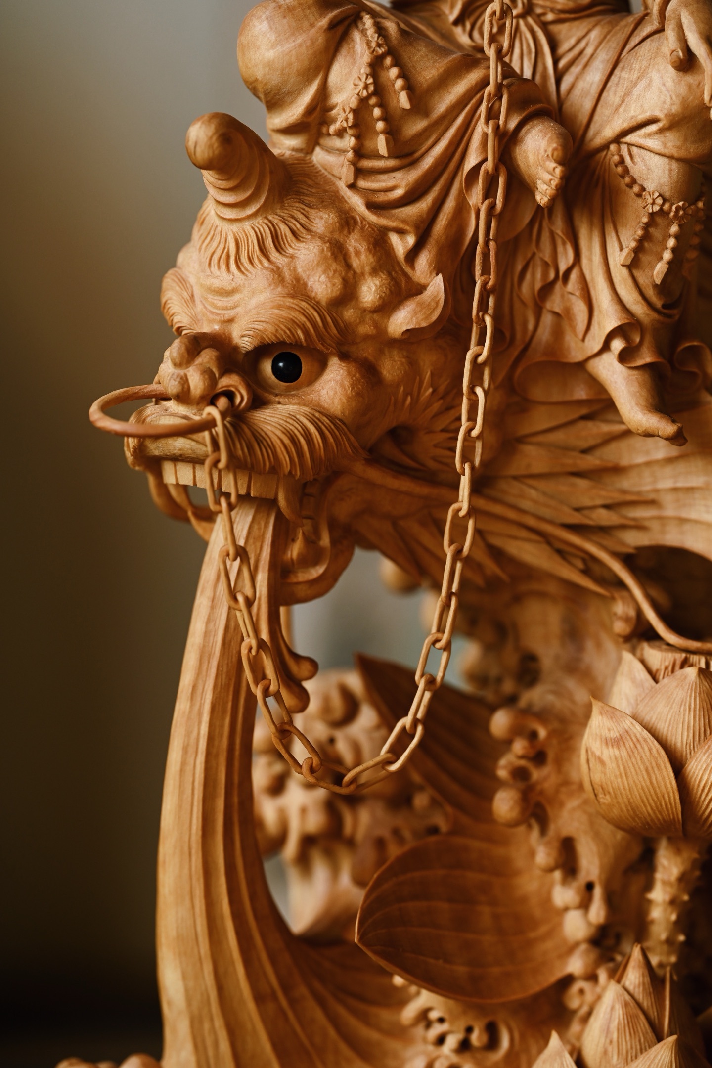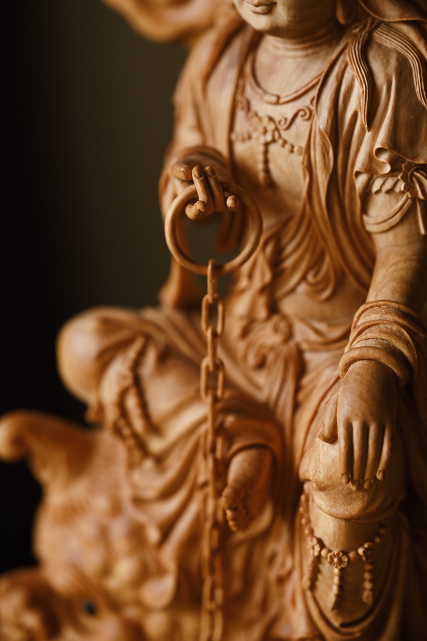 观音头顶发髻高盘,温婉闲雅,双目下视,微露笑意,饰璎珞着宝衣,自在坐于鳌鱼之上,鳌鱼威猛霸气,整体端庄典雅,通静慈祥。