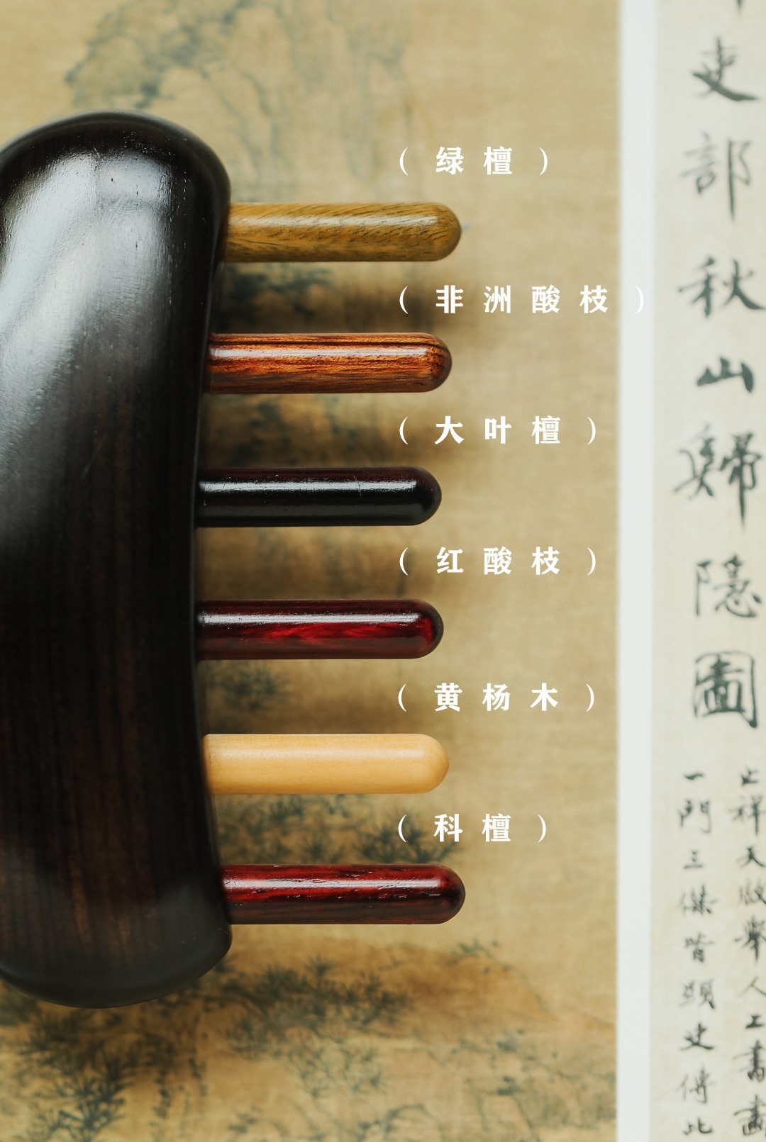 择紫光檀老料制,梳齿多种材质榫卯镶嵌,圆润饱满,弧形设计,按压到位,贴合穴位按摩更彻底。按摩头部、颈部、面部等身体各个部位穴位筋络,可配合自己的精油使用。