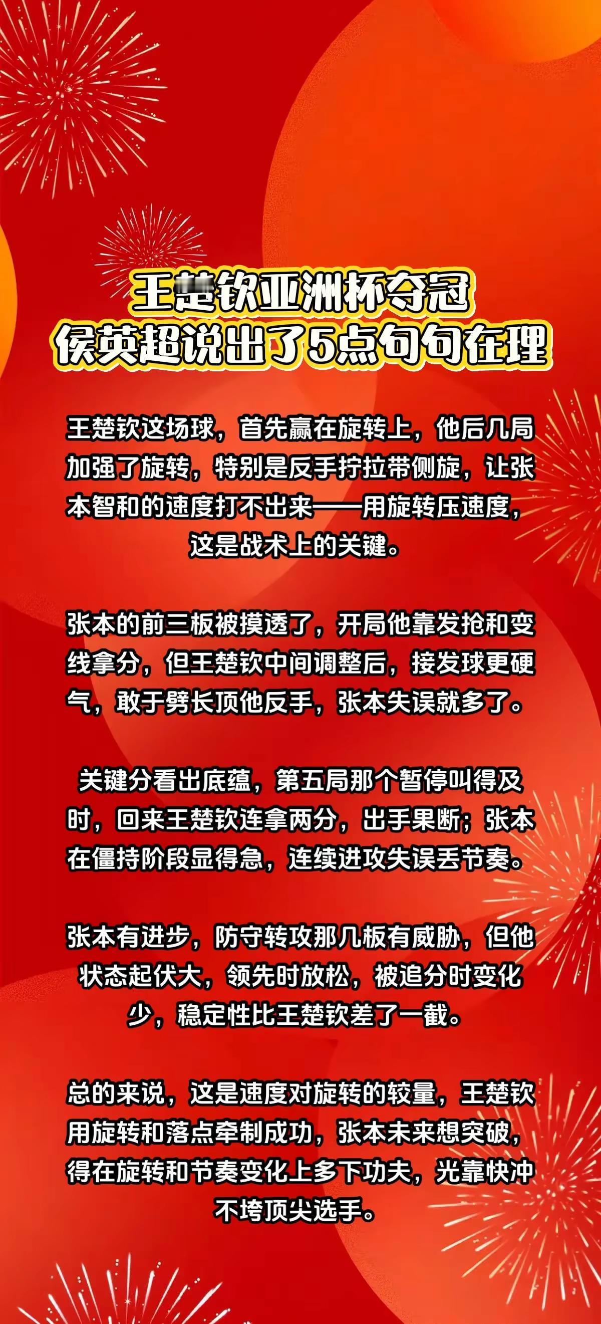 海口亚洲杯,王楚钦夺冠,侯英超评价5点。精选