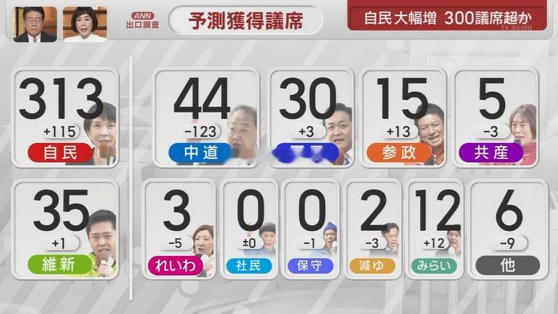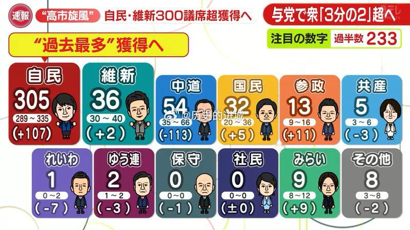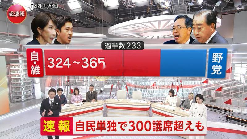 日本执政联盟将获众议院过半议席目前日本各个电视台的出口民调都显示,自民党可能赢得超过300个席位,执政联盟可能赢得超过三分之二的席位。海外新鲜事