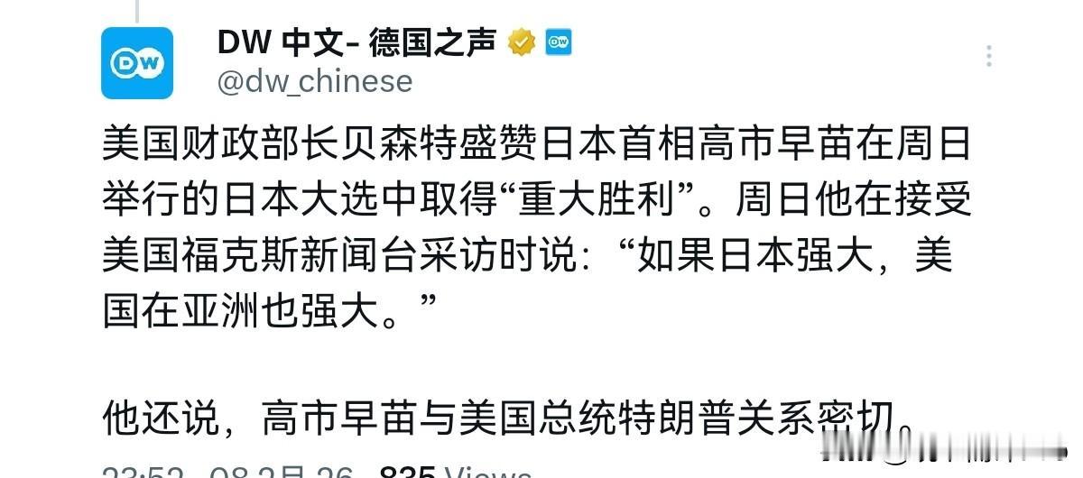 美国对高市早苗的胜选表示肯定!在得知自民党大胜之后,美国财长贝森特出来讲话了!贝森特表示,祝贺日本首相高市早苗在周日举行的日本大选中取得重大胜利。如果日本强大,美国在亚洲也强大。高市早苗与美国总统特朗普关系密切。很显然,美国的这一表态,非常值得重视。 为什么这样说呢?贝森特声称“如果日本强大,美国在亚洲也强大”,显然,美国的这一番表态,这是意有所指的。在中日关系处于冰冻状态的情况下,美国对于高市早苗的胜选,给予首肯,这说明美国明显有把日本当棋子,遏制我们的考量在。事实上,在这之前,特朗普公开力挺高市早苗,并明确表示欢迎高市早苗三月份访问美国。 在美国眼中,作为美国对华战略的一环,高市早苗无疑是美国认可的人。这个“认可”,当然不是因为美日所谓的“同盟友谊”,而是因为高市早苗的极右路线、扩军野心,恰好与美国在亚太遏制中国的战略高度契合。美国要的从不是一个真正强大的日本,而是一个甘愿为美国战略利益冲锋陷阵的“打手”,而高市早苗很符合美国对于日本的定位。 从美国的角度而言,让日本消耗中国,非常符合美国的战略利益。在美国不断的破坏国际规则的情况下,没有人相信美国会与我们互利共存。中美之间也许会有阶段性的缓和关系,但美国绝对有意愿让我们陷在麻烦之中。因此,在美国不得不与我们缓和关系的背景下,中日的博弈越来越激烈,可能是必然。