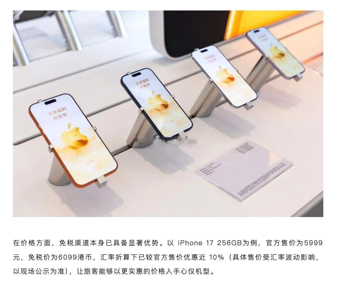 以iPhone 17 256GB为例,官方售价为5999元,免税价为6099港币(约合5416元),汇率折算下已较官方售价优惠近10%。