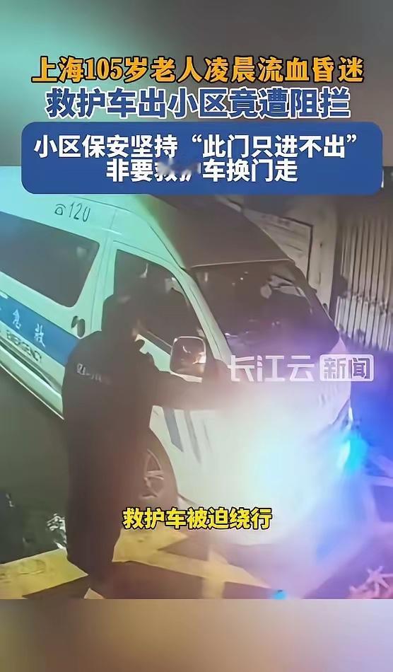 “必须严惩!”1月31日,上海,一105岁老人在家中摔倒,额头严重受伤,流血昏迷,在救护车运送过程中,因小区保安以“东门只进不出”为由,坚持让救护车换个门走,救护车只能绕行,被硬生生耽误5分钟!网友:拿着鸡毛当令箭! 这位被网友心疼不已的老人姓孟,已是105岁高龄,一辈子熬过风雨,本该安享晚年,却在凌晨两点的寒夜遭遇惊魂一刻。起夜时脚下一滑,额头重重撞在桌角,鲜血瞬间涌出来,顺着眼角、脸颊往下淌,浸透了睡衣领口。家属发现时,老人已经昏迷不醒,呼喊不应,只能颤抖着拨通120,短短几分钟像一个世纪般漫长。急救人员赶到后,七手八脚把老人从五楼抬下来,担架上的孟阿婆脸色惨白,额头上的伤口还在汩汩冒血,医护人员一边止血一边催促司机:“快点,争取黄金抢救时间!” 谁能想到,最关键的“生命通道”竟卡在了小区东门。救护车司机选这条道,就是因为它离老人楼栋最近,出门直接上主干道,可岗亭里的保安却摇着头摆手,语气硬邦邦:“东门只进不出,规矩不能破,你们绕南门走吧。”家属急得直跺脚,指着担架上昏迷的老人哀求:“你看看这情况,多耽误一分钟都可能出大事!”可保安不为所动,依旧坚守所谓的“规定”。救护车被迫倒车、绕行,原本三分钟的路程硬生生多花了五分钟,这五分钟里,家属攥着老人冰凉的手,听着她微弱的呼吸,心都提到了嗓子眼。 更让人费解的是事后的解释。物业经理嘴上说着“特种车辆紧急情况可通行”,当班保安却辩称“电脑和遥控都失灵了”,可记者到场实地查验时,门禁系统明明运转正常。一句“天气冷可能失灵”的敷衍说辞,根本经不起推敲。难道设备失灵了,就没有人工抬杆的应急方案?难道“只进不出”的规矩,比百岁老人的生命还重要?要知道,孟阿婆虽然最终脱离危险,但额头那道7厘米的豁口,还有昏迷中可能遭遇的风险,都让这场“人为耽误”显得格外刺眼。 这绝非个例。武汉金荷花园小区曾发生过更令人痛心的事:44岁的余先生突发疾病,救护车赶到后却因小区乱停车无法调头,倒着开出小区花了15分钟,最终病人在送医途中离世;上海另一小区的92岁心衰老人,救护车离开时被私家车堵了20分钟,只因物业没登记外来车辆信息。这些案例背后,都藏着同样的问题——基层管理者的僵化思维和应急机制的缺失。保安手握的本是“维护秩序”的职责,却变成了“刁难他人”的权力,把制度当成了推卸责任的挡箭牌。 有人说“规矩面前无特例”,可规矩的初衷是什么?是保障居民的安全和便利,不是成为漠视生命的冰冷枷锁。宁夏银川万达华宅小区,曾经因为消防车道被绿化挤占,宽仅2米,居民十年忧心忡忡,直到检察院启动公益诉讼,多部门联动整改,才把车道拓宽到4米,让“生命通道”真正畅通。这说明,不是没有解决办法,而是有没有把群众的安危放在心上。 孟阿婆的幸运,让我们暂时避免了一场悲剧,但不能因此忽视问题的本质。保安的失职背后,是物业培训的缺位——他们或许从未被告知,紧急情况下特种车辆享有优先通行权;是应急机制的空白,没有针对设备失灵、道路堵塞的备选方案;更是责任意识的淡薄,把“按规矩办事”当成了不作为的借口。5分钟,在平时或许转瞬即逝,但在急救场景里,可能就是生死之差。 我们不需要“通情达理”的特权,只需要“以人为本”的底线。当救护车鸣笛时,多一份主动避让,少一份刻板教条;当设备失灵时,多一种应急办法,少一句无能为力。生命只有一次,容不得半点敷衍和耽误。 各位读者你们怎么看?欢迎在评论区讨论。