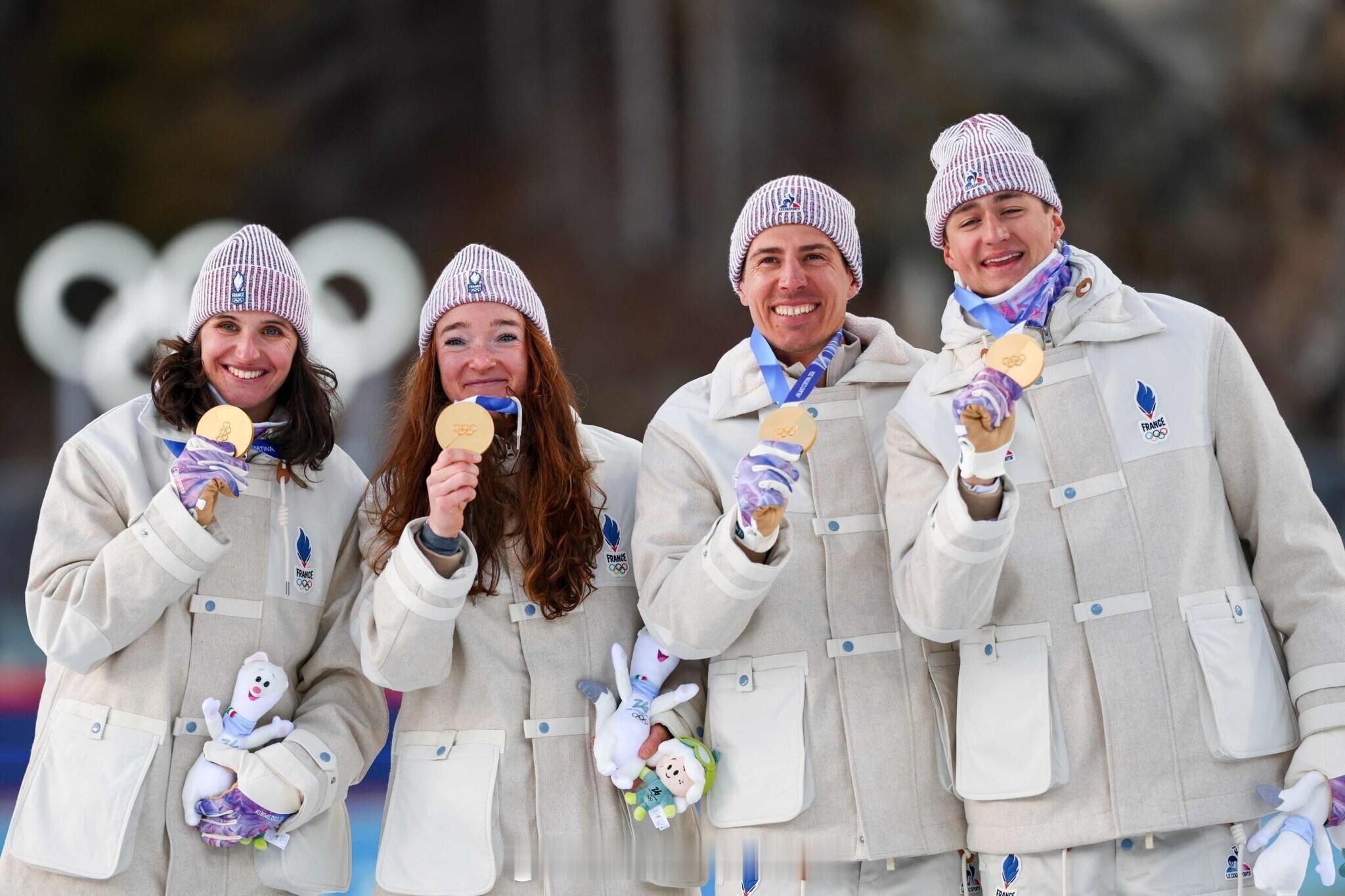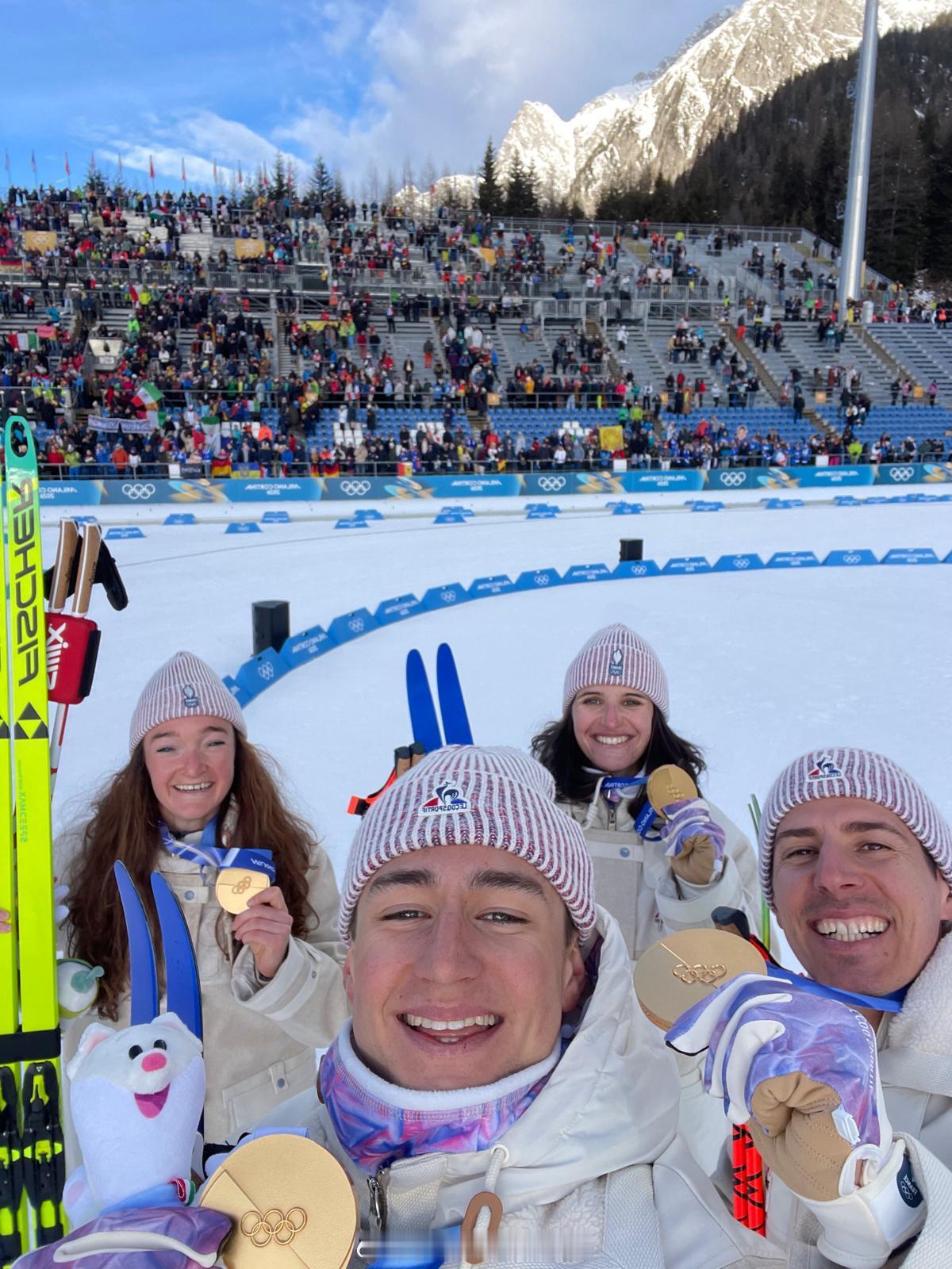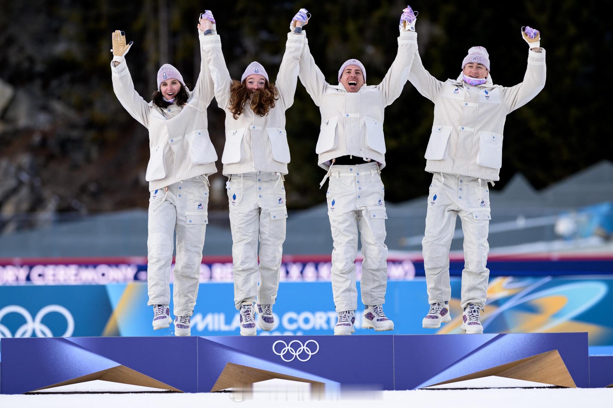 法国四人组 埃里克·佩罗(Éric Perrot) / 昆汀·菲永-马耶(Quentin Fillon-Maillet) / 卢·让莫诺(Lou Jeanmonnot) / 朱莉娅·西蒙(Julia Simon) 凭借超强团队配合,拿下米兰-科尔蒂纳2026冬奥会冬季两项 混合接力金牌!这是法国队在本届冬奥会收获的首枚金牌!🔥