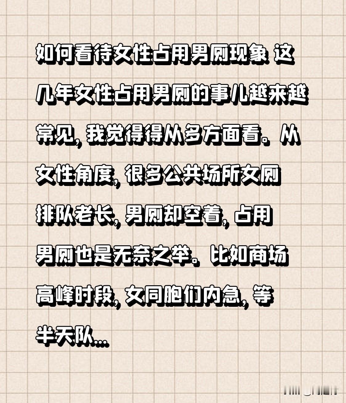 如何看待女性占用男厕现象 如何看待女性占用男厕现象 这几年,女性占用男厕的现象愈发常见,需从多方面看待。 从女性角度而言,许多公共场所中女厕外排着长队,男厕却空无一人,占用男厕实属无奈之举。例如商场高峰时段,女同胞内急,排队许久队伍却不见挪动,看着空着的男厕,难免心动。 但从男性角度来说,自己如厕时突然有女性进入,多少会感到不自在,隐私也会受到影响。 实际上,这反映出公共厕所规划不合理。相关部门应予以重视,合理调整男女厕位比例,从根源上解决问题,避免女性占用男厕引发的尴尬与争议。