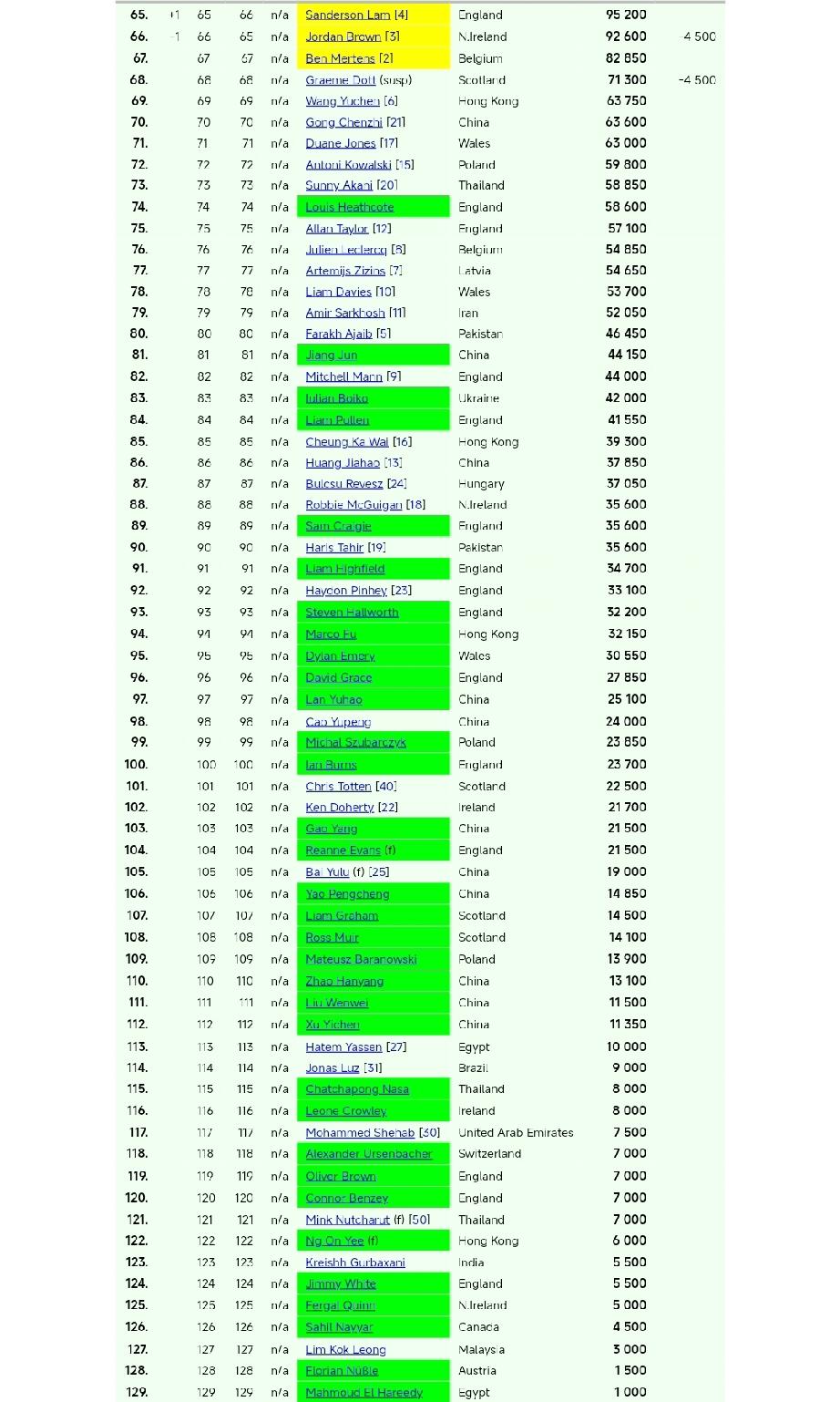 斯诺克最新世界排名 中国军团赵心童第7、吴安仪第122位! 截至2026年斯诺克世界大奖赛结束(2月8日),中国球员的最新世界排名如下: 7 赵心童 中国 803,550 10 肖国栋 中国 617,500 12 吴宜泽 中国 558,900 13 丁俊晖 中国 550,850 16 斯佳辉 中国 478,900 20 张安达 中国 380,950 26 庞俊旭 中国 271,000 28 周跃龙 中国 247,550 30 雷佩凡 中国 256,800 31 袁思俊 中国 249,900 38 徐思 中国 174,500 46 贺国强 中国 146,650 51 龙泽煌 中国 136,580 53 吕昊天 中国 133,358 56 常冰玉 中国 122,700 59 刘宏宇 中国 115,100 60 范争一 中国 113,450 69 王雨晨 中国香港 63,750 70 巩晨智 中国 63,600 81 江俊 中国 44,150 85 张家玮 中国香港 39,300 86 黄佳浩 中国 37,850 94 傅家俊 中国香港 32,150 97 蓝裕豪 中国 25,100 98 曹宇鹏 中国 24,000 103 高阳 中国 21,500 105 白雨露 中国 19,000 106 姚鹏成 中国 14,850 110 张翰洋 中国 13,100 111 刘文炜 中国 11,550 112 许医尘 中国 11,350 122 吴安仪 中国香港 6,000
