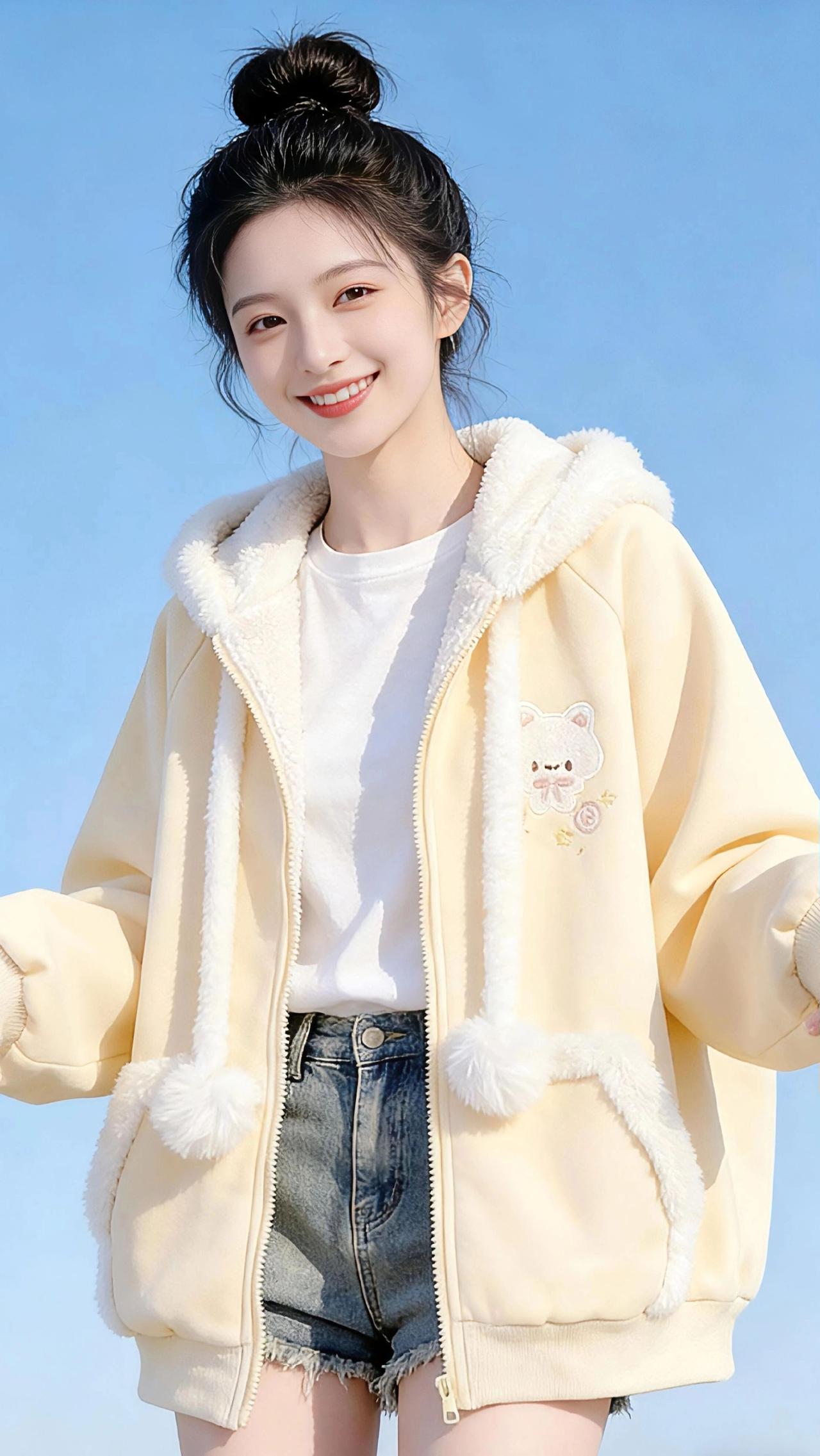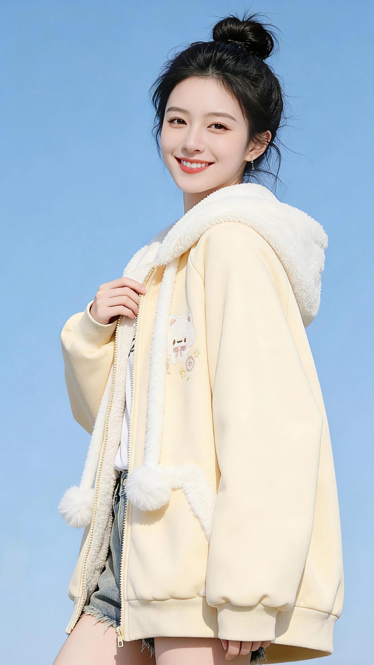 在被蓝天铺得透亮的冬日里,她像一颗刚剥好的糖心蛋,暖黄的外套蓬松又柔软,裹着二十岁少女独有的清甜。 风掠过雪地时,她衣摆上的绒毛跟着轻晃,像一团团软乎乎的云。兜帽边缘的白色毛绒滚边,和她丸子头旁散落的碎发一样,在晴日里泛着温柔的光。小熊刺绣趴在胸前,随着她抬手的动作轻轻起伏,为这一身松弛的暖意,添上了几分俏皮。 她伸手牵住帽绳上的毛球,指尖的温度透过绒线,一路传到心里。短靴踩在雪地上,发出细碎的声响,和她笑起来的梨涡一样,让人忍不住跟着弯起嘴角。原来冬天最动人的模样,从不是厚重的包裹,而是这样——用一件暖黄的外套,就能把寒风都酿成蜜糖。 高级感穿搭 冬季穿搭 新年穿搭