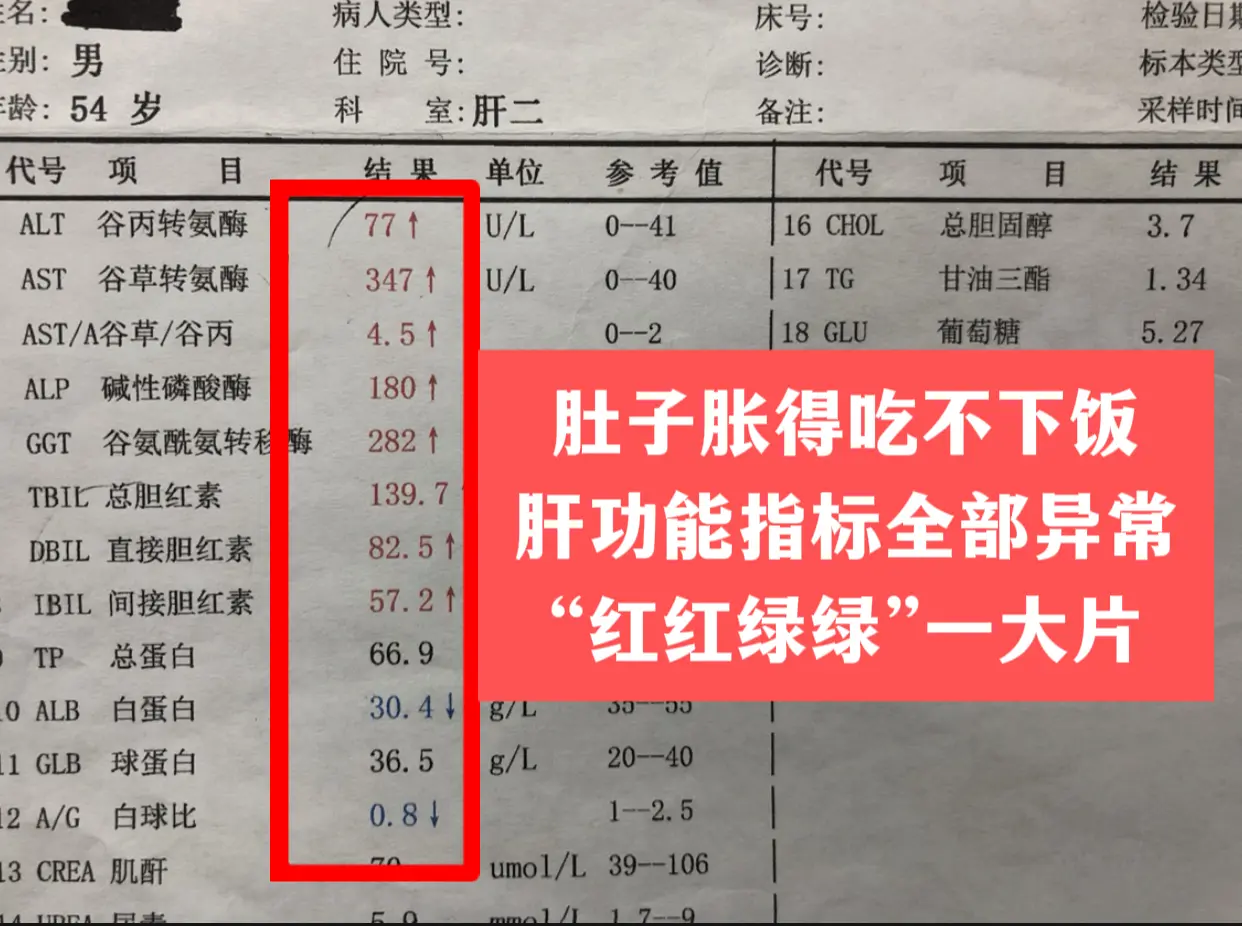 54岁的乙肝患者,一进门就捂着肚子说胀得难受,吃不下饭,脸色还有点发黄,我打眼一看就知道有肝病。检查结果出来,肝硬化伴腹水,肝功能化验单红一片绿一片,指标全乱了!