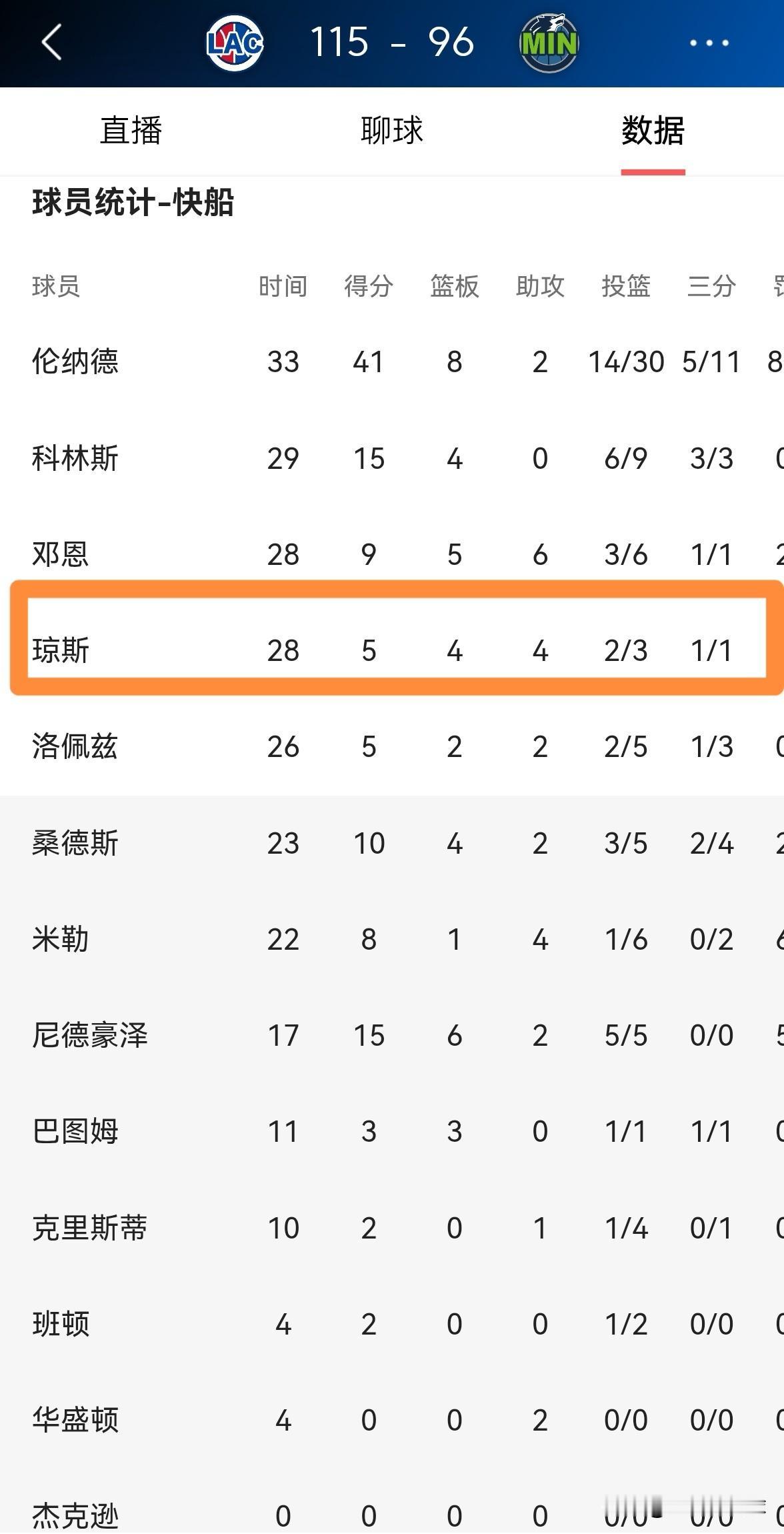 快船悍将小琼斯真是既便宜又好用!在今天快船客场以115:96战胜森林狼的比赛中,小琼斯首发出战28分钟,投篮3中2,其中三分球1中1得到5分,还有4篮板4助攻3抢断1盖帽,他的场上正负值为+22。 毫不夸张的说,以小琼斯在攻防两端的表现来看,他绝对配得上一份平均年薪为两千万美元的合同,小琼斯的性价比真是太高了。