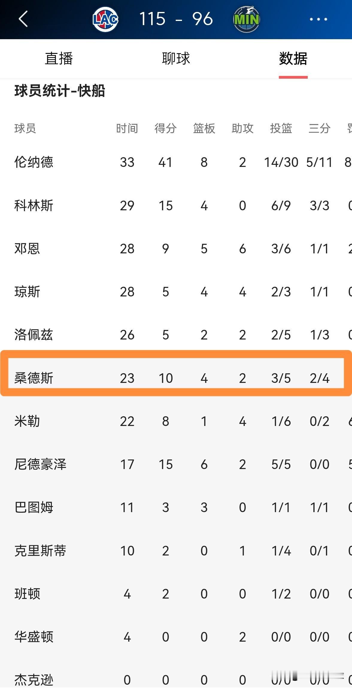 快船新星桑德斯真是敢打敢拼!在今天快船客场以115:96击败森林狼的比赛中,桑德斯在攻防两端敢打敢拼、毫不畏惧,真是初生牛犊不怕虎。 全场比赛下来,桑德斯替补出战23分钟,投篮5中3,其中三分球4中2、罚球3中2得到10分4篮板2助攻,他的场上正负值为+7。 随着桑德斯被快船成功转正,他在球队的未来可以说是一片光明。