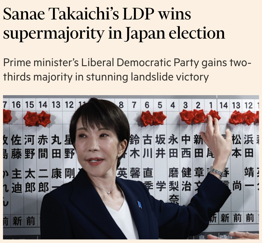 ² 至少当下,高市早苗在日本国内外的地位超级高。她取得了超过导师安倍晋三的超级授权,她现在可以推进任何她想要推进的安全化议程。军事、经济、科技。。。日本民众用选票证明了他们依然值得被警惕。他们绝对不是一些一厢情愿的和平博主说得那么不关心战后议程。