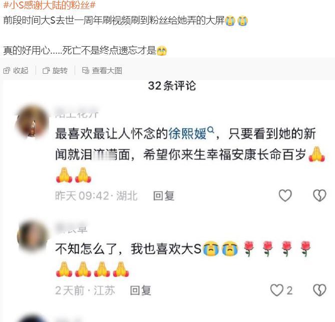 小s首次通过社交平台,回应了大s的事情 起因是网友在内地投屏,放了很多的大s以前的视频,来纪念大s 小s通过工作人员原话转达感动:“帮我郑重谢谢他们,很感动,感谢”,并明确表示这些心意“都有看到” 最后徐家诚挚的表达我们对内地网友的敬意 其实网友更用心纯粹悼念大S,应该也是爱屋及乌吧,很多人是大s的粉丝,也有不少是小s的粉丝 她俩羁绊太深了,比很多双胞胎可能还要深,仿佛失去了一半灵魂 姐妹俩是难得的艺人当中比较有活人感的,因为把观众当成平等的人,所以这俩姐妹才会这么真诚,把家事和朋友的趣事分享给我们 我没有粉过s姐妹,只是觉得很亲切,很真实,直到大s没了,才觉得十分惋惜,有才华又真诚讲义气的艺人,真实接触处过姐妹俩的没有说她们不好的 我觉得,大s走的真的是太突然了,其实大s真的很多粉丝,而且都已经长大成为了消费主力军,我不晓得大s知不知道,因为当时的她如果离婚来搞事业,不跟她前夫纠缠我觉得她很容易东山再起……他们家事闹成这样我一直都是觉得s必然是忍无可忍了。