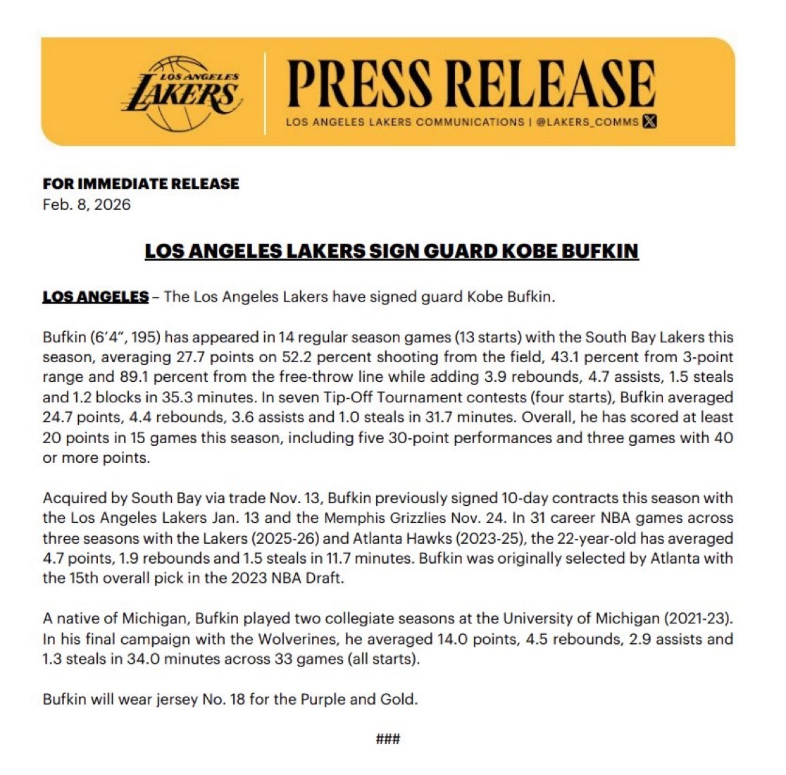 湖人官宣签约科比-巴夫金